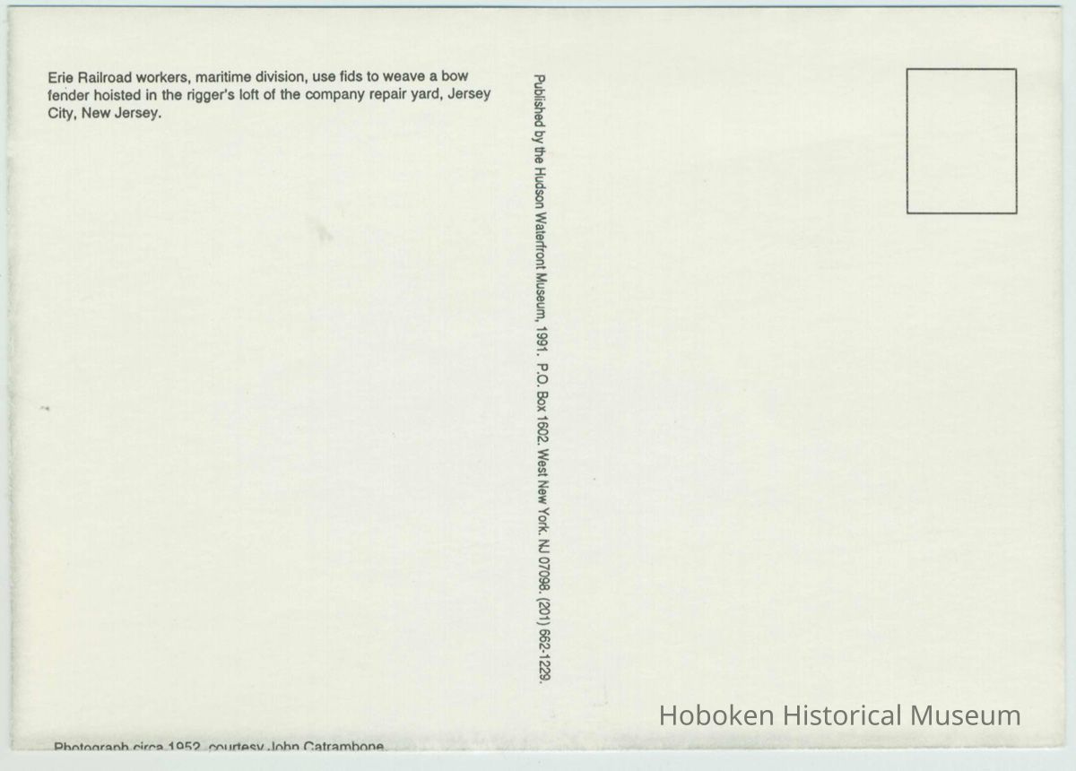 Postcard: black-and-white photo of two workers weaving rope using fids to make a bow fender, ca. 1952; published by Hudson Waterfront Museum, West New York, 1991. 4" x 6" print. Photographer not identified. 6 copies.