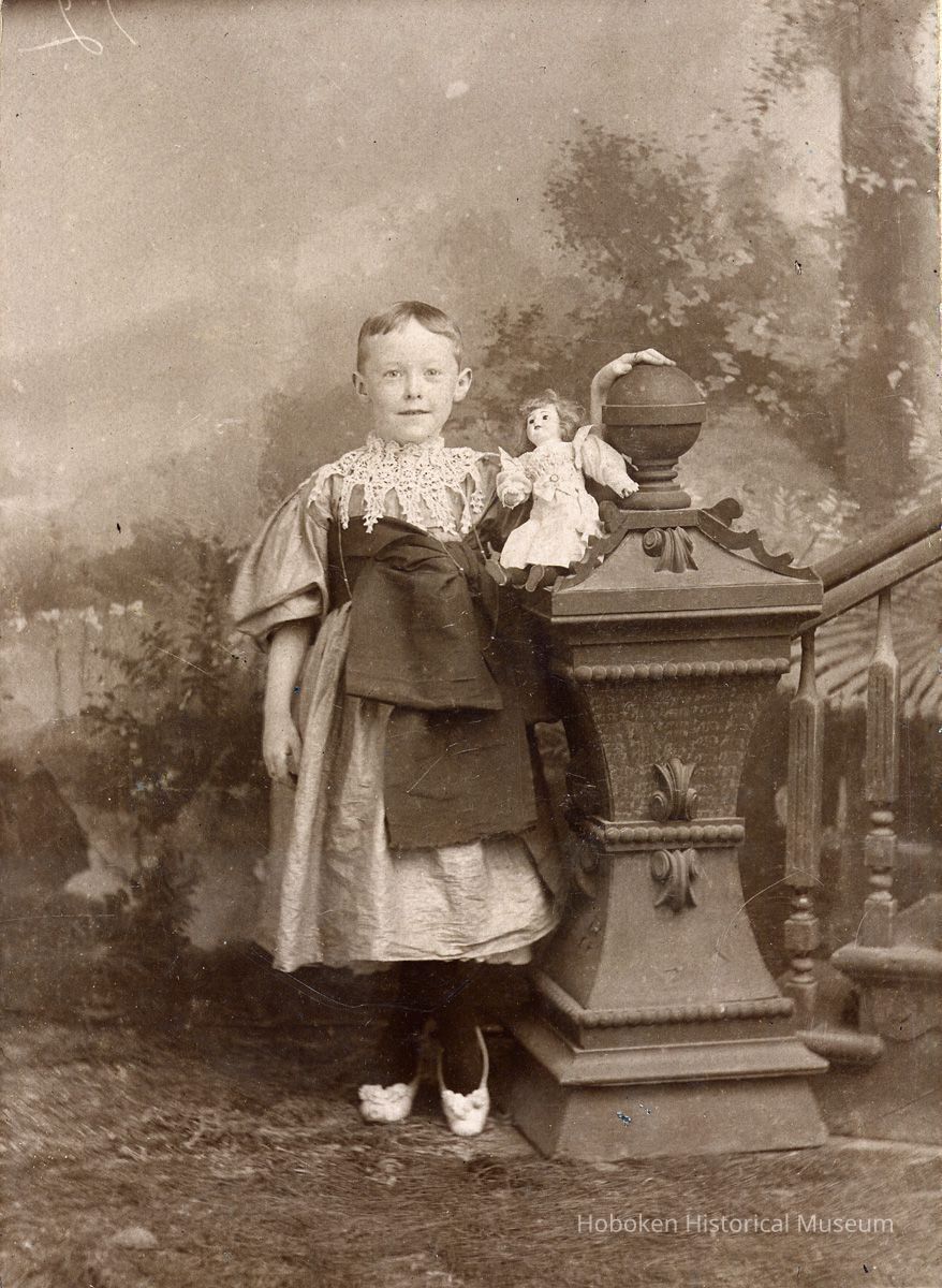The boy appears to be about 7-9 years old. Standing next to a newel post with a girl's doll lying on it, he is dressed whimsically, if not comically, in a dress or gown plus a lace collar. A very large sash of dark fabric is tied crudely in a bow around his waist. With dark stockings, he wears low-cut decorated woman's shoes (with low heels) that have bows. The nature of the photo is not indicated such as whether this was a costume for an amateur theatrical or a pageant. He does appear happy and smiles with a certain glee at the camera.