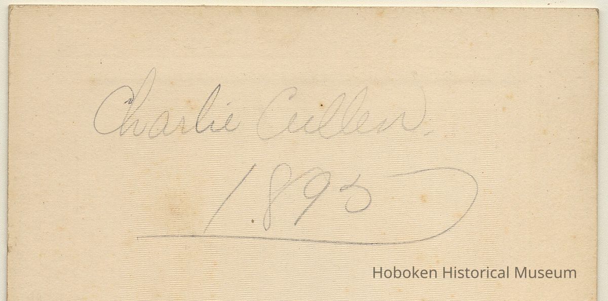 2-3/4" x 3-13/16" high sepia-tone print on 4-1/4" x 6" embossed mount. Photograph taken by [George W.] Day, Hoboken (imprinted in blue at front bottom.) Reverse has contemporary holograph pencil: Charlie Cullen, 1895.