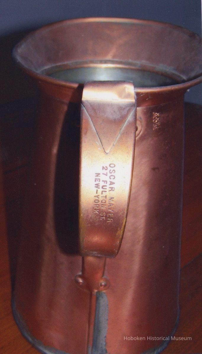 Photo 3: detail of pitcher handle with stamped name and address of maker (Oscar Mayer, 27 Fulton St., New-York (sic - city is hyphenated.)