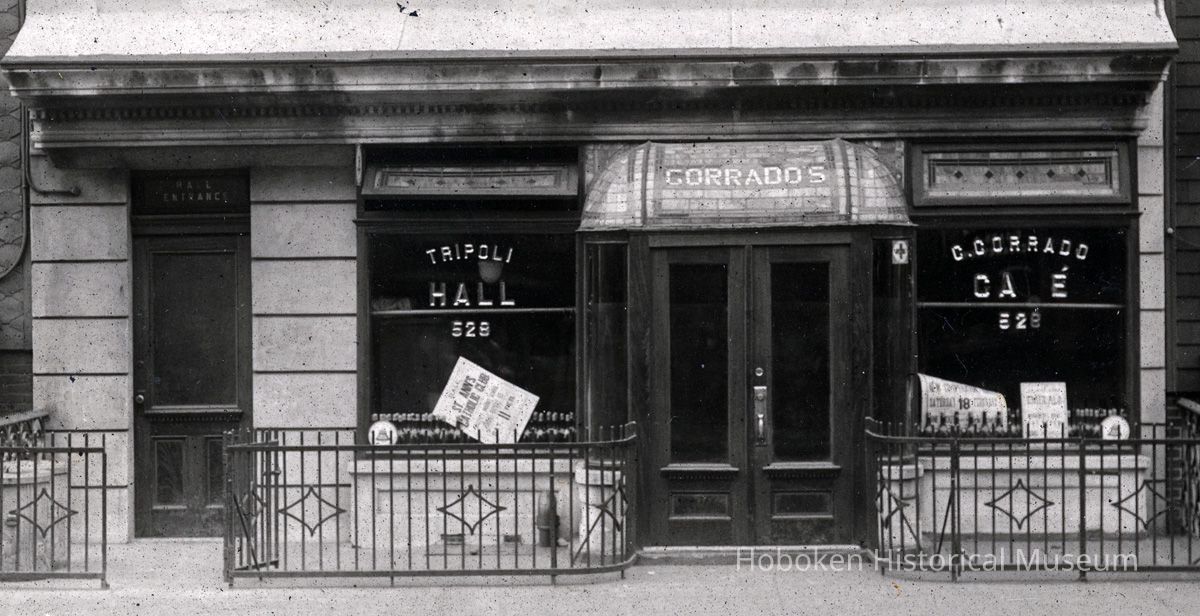 Photo 1, detail center: 528 Adams St. street level facade of Tripoli Hall and C. Corrado Cafe; the door transom at left is lettered: Hall Entrance.