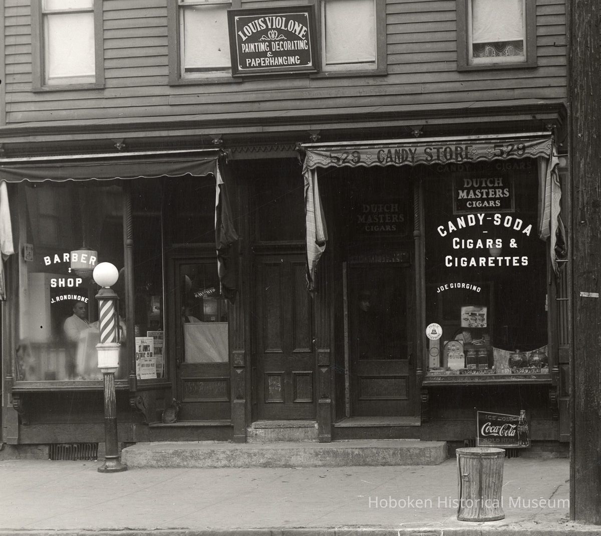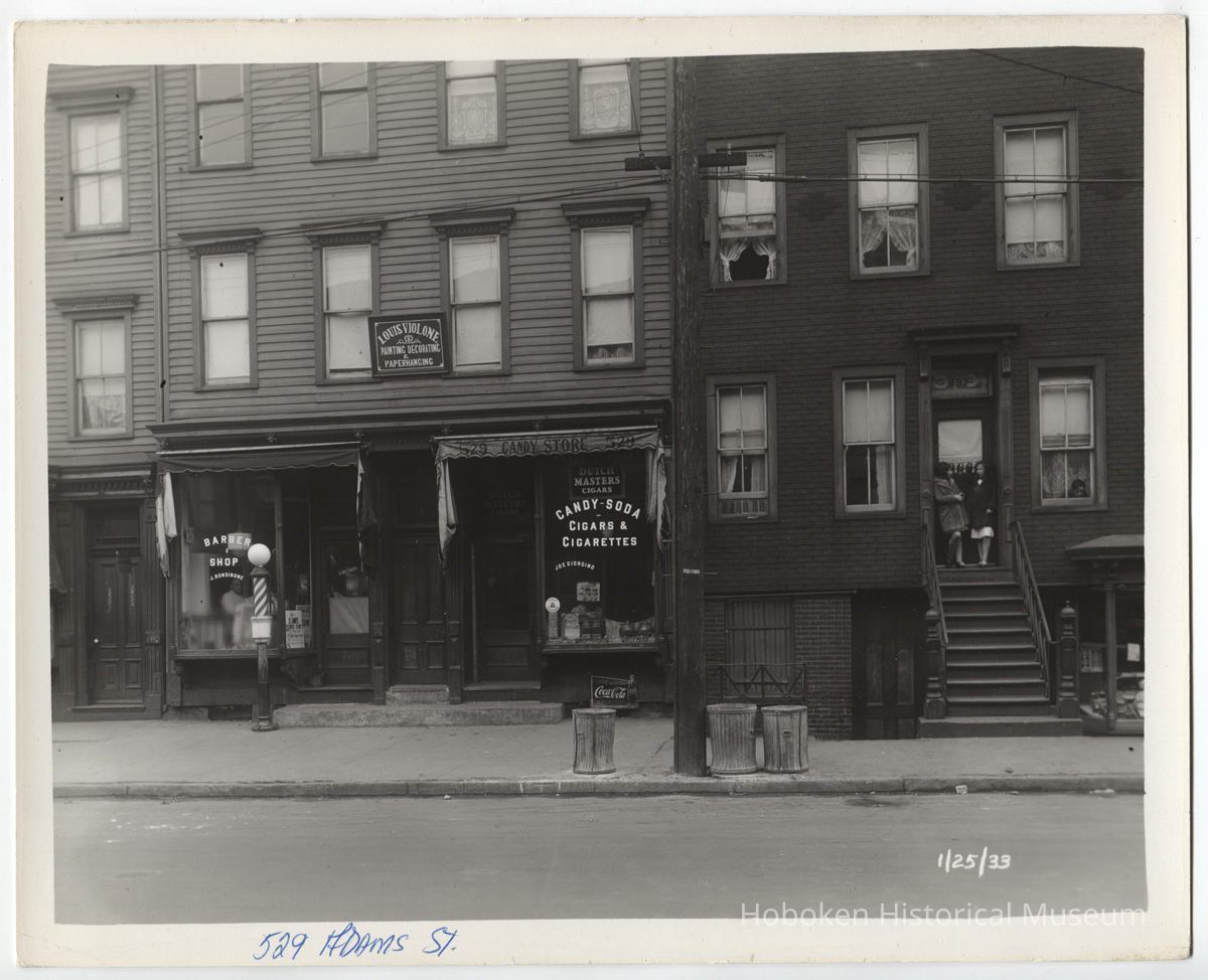 Photo 2, detail center, shops and signs at 529 Adams St.: J. Rondinone, Barber Shop; candy store; Louis Violone, Painting, Decorating & Paperhanging.