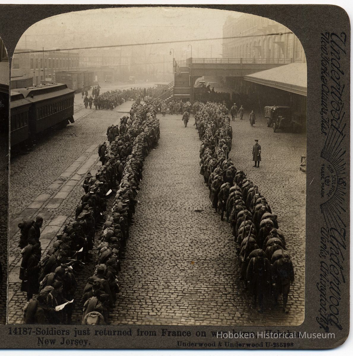 Stereoview: 14187 - Soldiers just returned from France on way home, Hoboken, N.J. Underwood & Underwood. N.d., ca. 1919-1920.