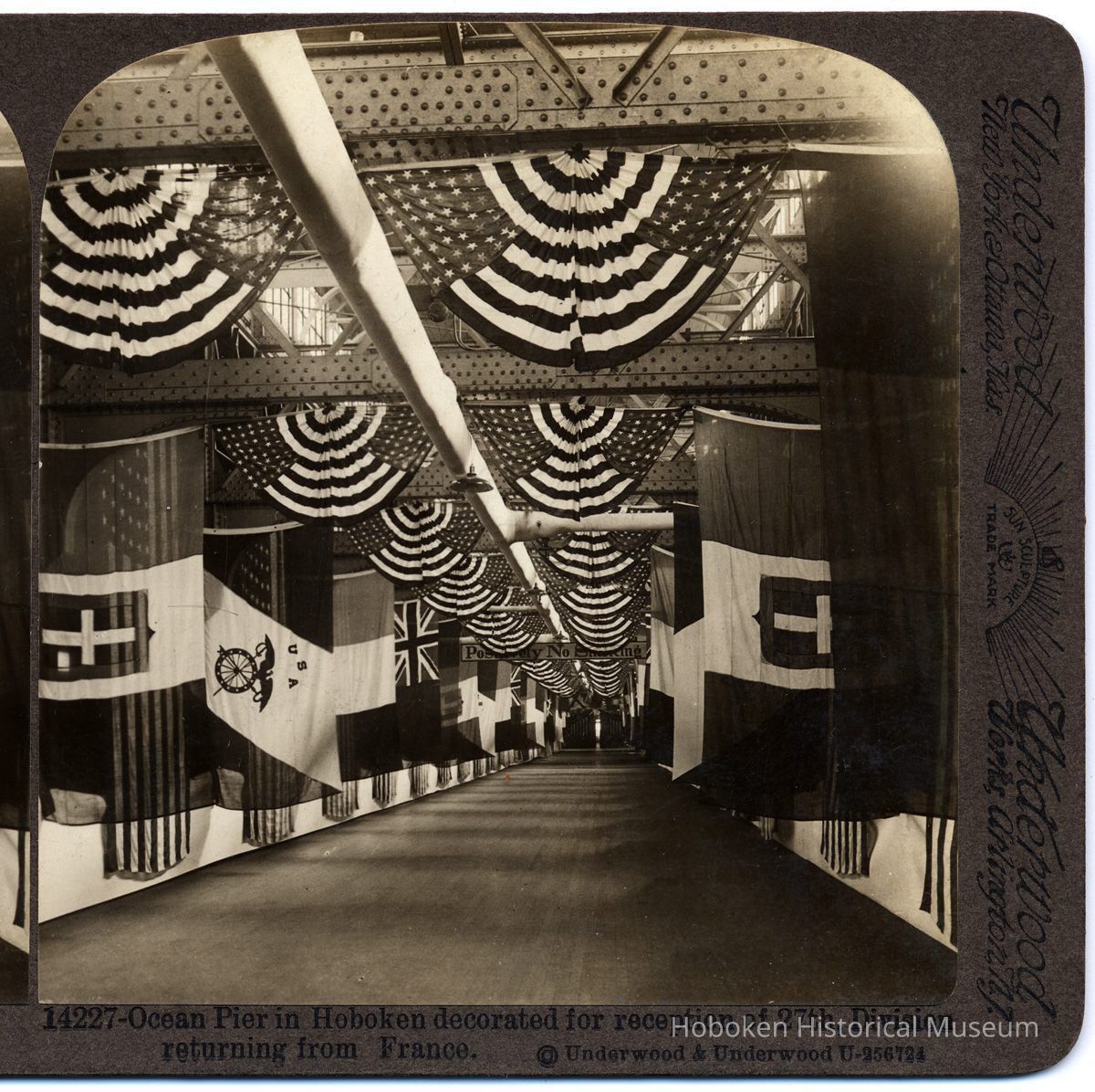 Stereoview: 14227 - Ocean Pier in Hoboken decorated for reception of 27th, Division returning from France. Underwood & Underwood. N.d., ca. 1919-1920.