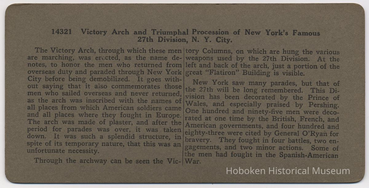 Notes: 2012.001.0046, text on reverse: 14321 Victory Arch and Triumphal Procession of New York's Famous 27th Division, N.Y. City. The Victory Arch, through which these men are marching, was erected, as the name denotes, to honor the men who returned from overseas duty and paraded through New York City before being demobilized. It goes without saying that it also commemorates those men who sailed overseas and never returned, as the arch was inscribed with the names of all places from which American soldiers came and all places where they fought in Europe. The arch was made of plaster, and after the period for parades was over, it was taken down. It was such a splendid structure, in spite of its temporary nature, that this was an unfortunate necessity. Through the archway can be seen the Victory Columns, on which are hung the various weapons used by the 27th Division. At the left and back of the arch, just a portion of the great "Flatiron" Building is visible. New York saw many parades, but that of the 27th will be long remembered. This Division has been decorated by the Prince of Wales, and especially praised by Pershing. One hundred and ninety-five men were decorated at one time by the British, French, and American governments, and four hundred and eighty-three were cited by General O'Ryan for bravery. They fought in four battles, two engagements, and two minor actions. Some of the men had fought in the Spanish-American War. Original or Copy: Original Status: OK Status By: dw Status Date: 2012-06-13