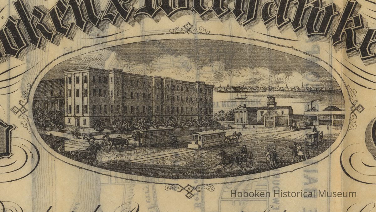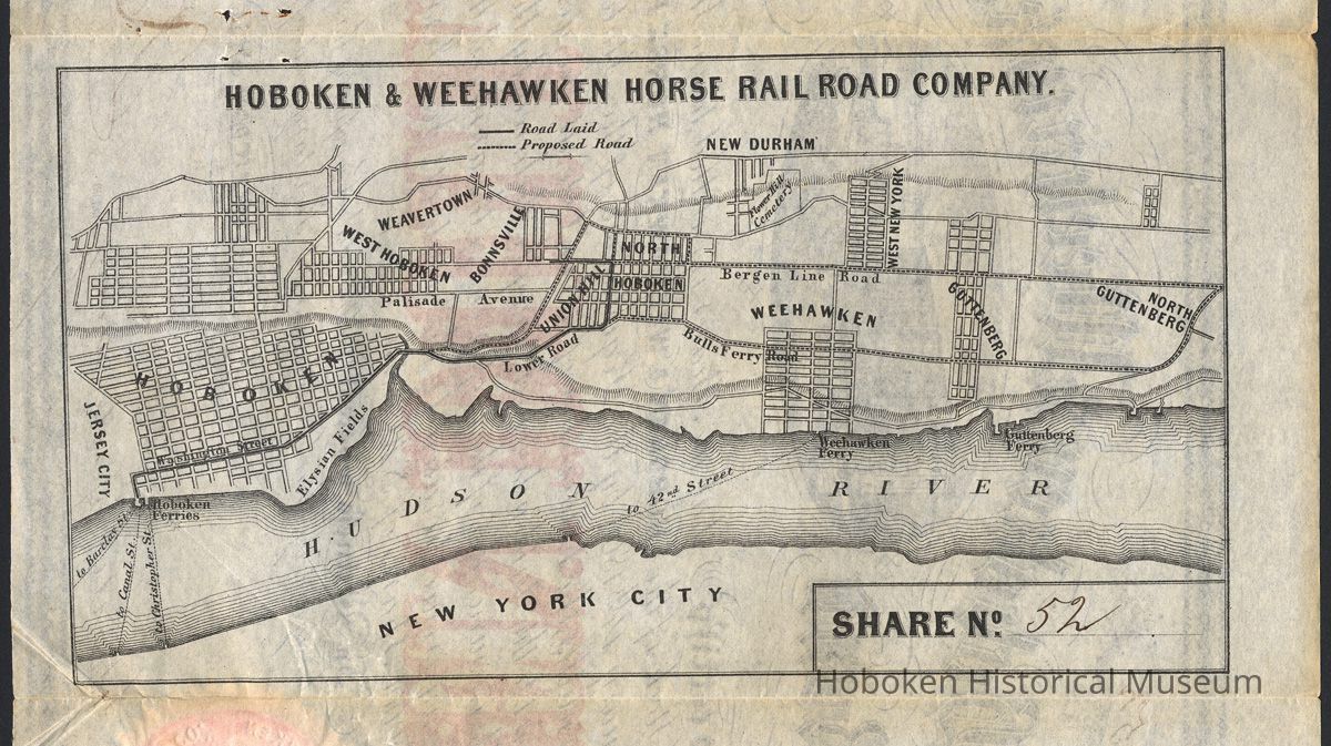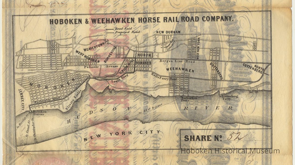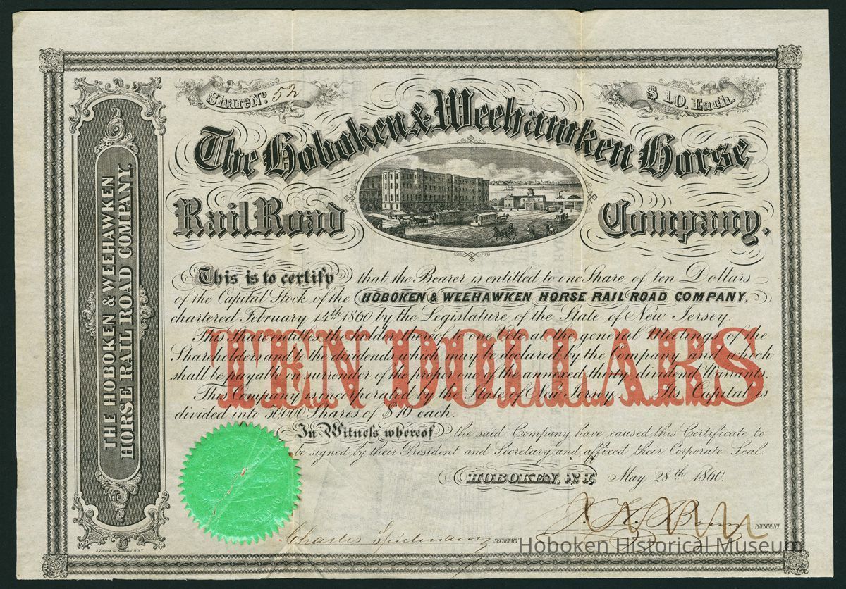 This is to certify that the Bearer is entitled to one Share of ten Dollars of the Capital Stock of the Hoboken & Weehawken Horse Rail Road Company, chartered February 14th, 1860 by the Legislature of the State of New Jersey.