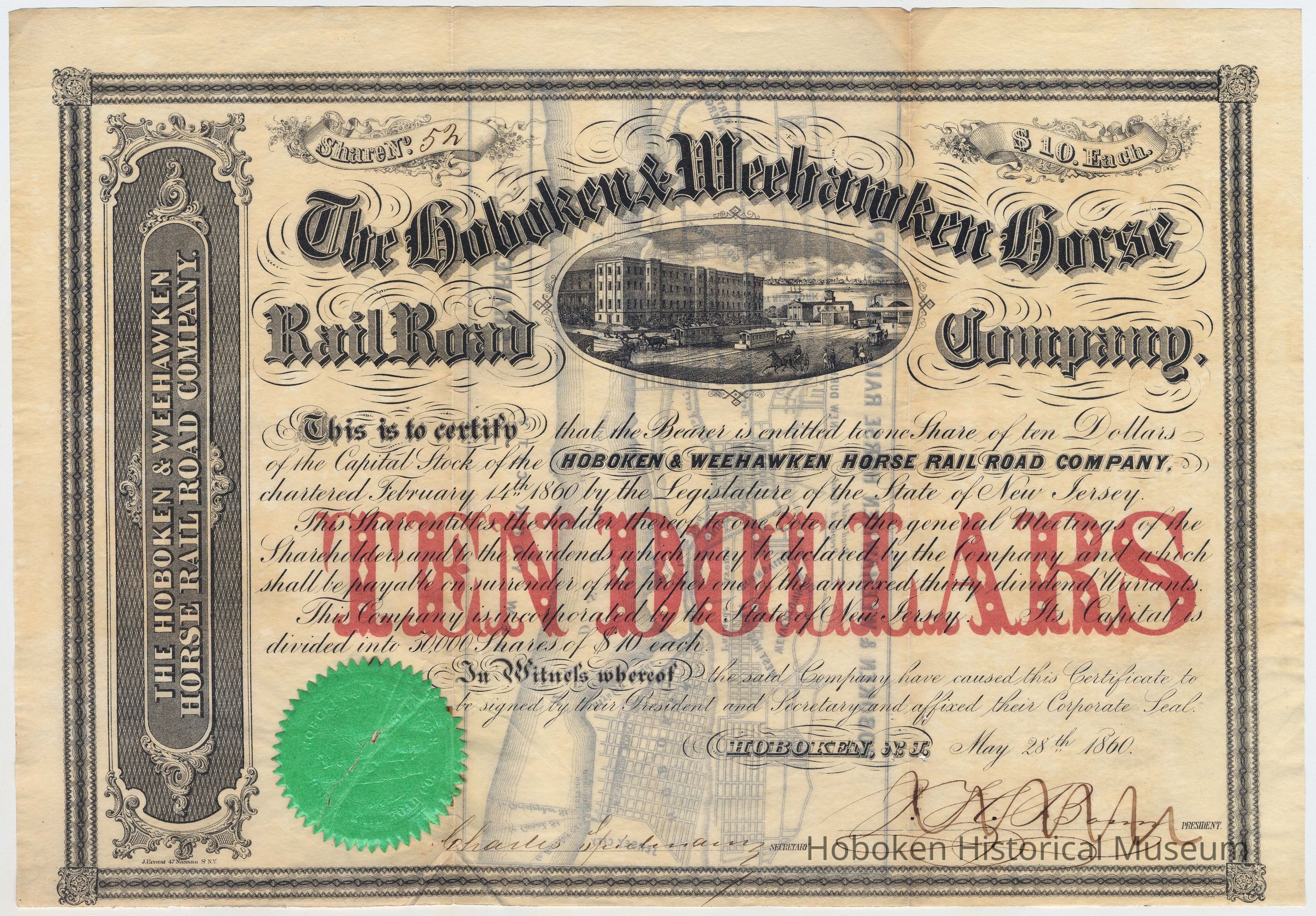 The Hoboken & Weehawken Horse Rail Road Company, one Ten Dollar share, issued Hoboken, N.J., May 28, 1860; share no. 52.