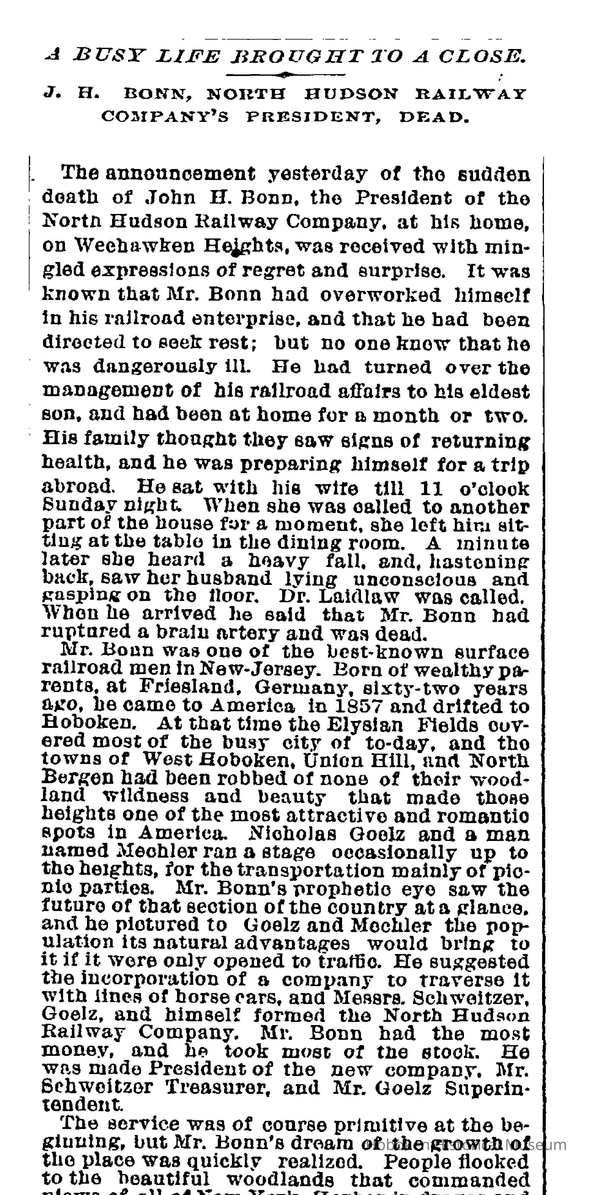 This company began construction in August 1860 and commenced operations in December of that year. It was not the first surface transportation company in Hoboken. (See library 2002.214.0006: The North Hudson County Railway. By Edward T. Francis & George W. Walrath. An illustrated article being the entire issue of The Marker, Vol. 5, No. 2, Sept. 1946. Issued by North Jersey Chapter, National Railway Historical Society.) By 1865, under Bonn, this company and two others were combined to become the North Hudson Railway Company, a predecessor to Public Service. Bonn was the driving force in surface transportation in this county for the rest of his life.