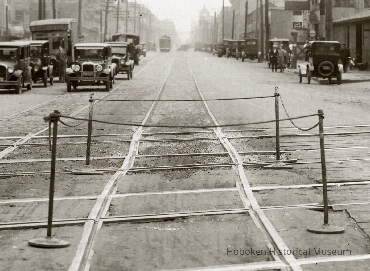 B+W photo looking south on Willow Ave. at 17th St.; streetcar tracks & freight rail crossing, Hoboken, n.d., (1927).