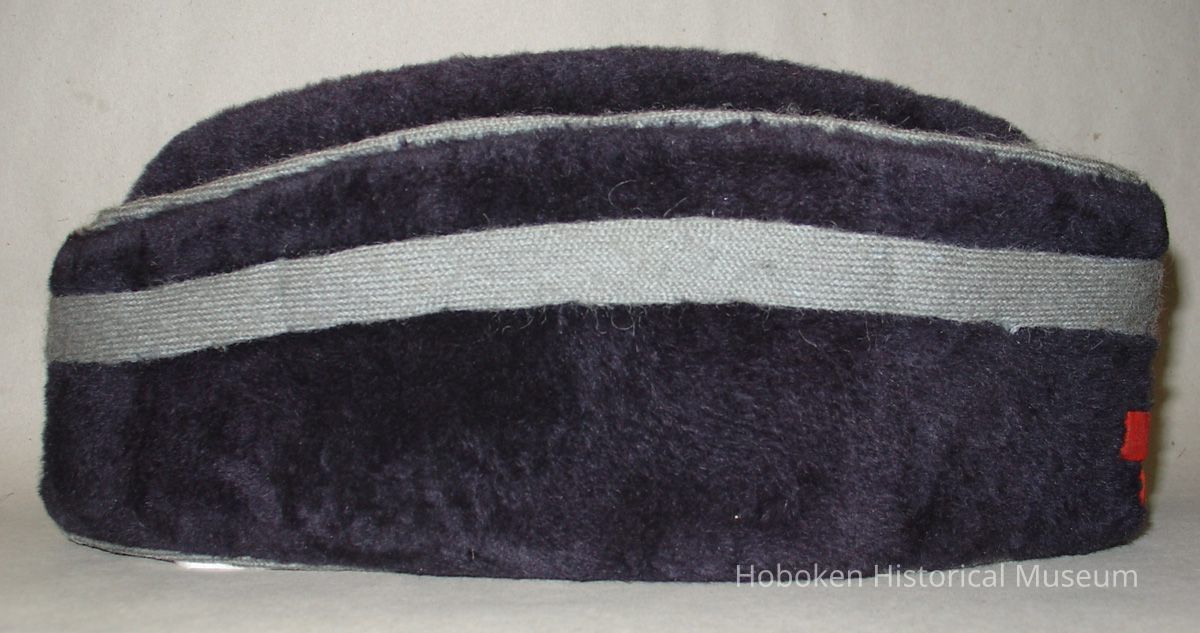 American Red Cross volunteer's cap for a winter uniform belonging to Mrs. Mary Markey of Hoboken, no date, ca. 1916-1925. Blue and gray wool fabric, lined.