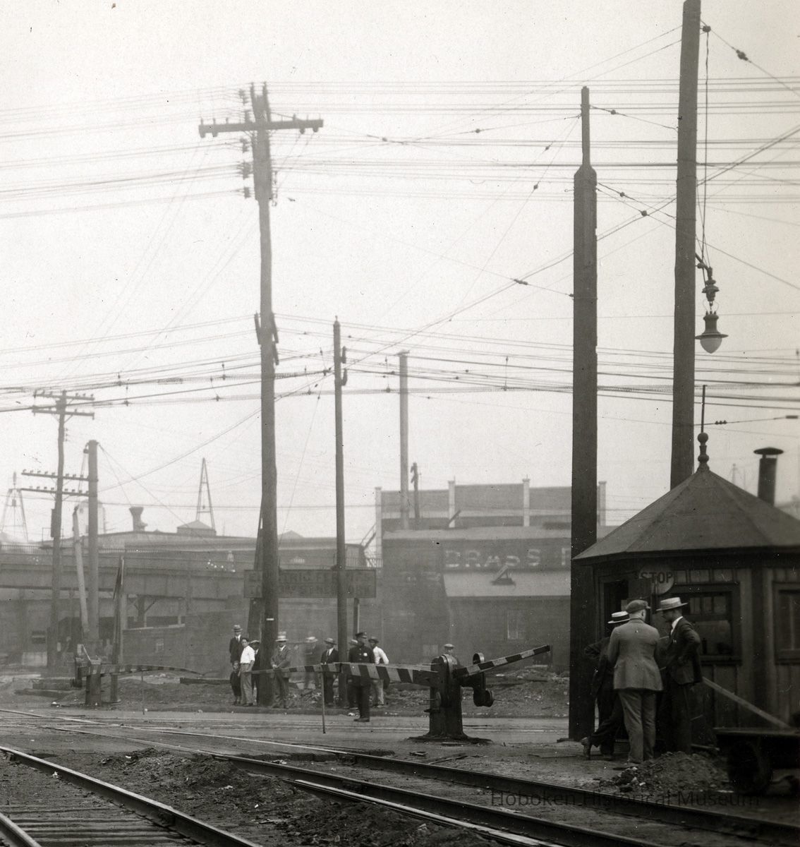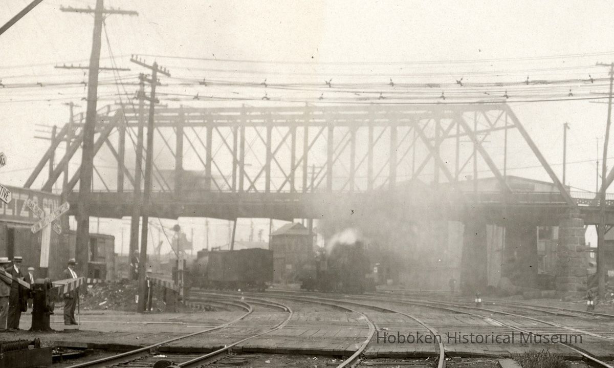 The railroad crossing signs are for tracks of the New York Central Railroad, Erie Railroad and the primary right-of-way holder, New Jersey Junction Railroad. Seventeenth Street can be seen to consist of only multiple tracks and no traffic lanes of any kind. The crossing gates are down; a locomotive is on the southern (right) track approaching the intersection.