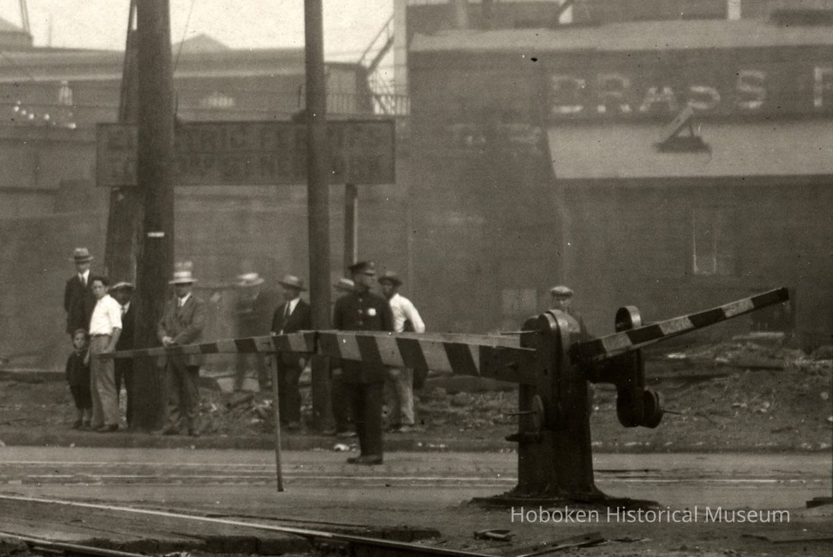 Black-and-white photo looking east on Seventeenth Street from west of Willow Avenue at the railroad right-of-way; streetcar tracks and freight rail crossing, Hoboken, no date, (1927).