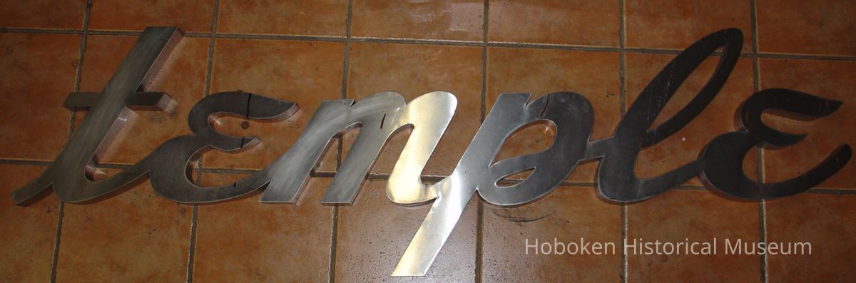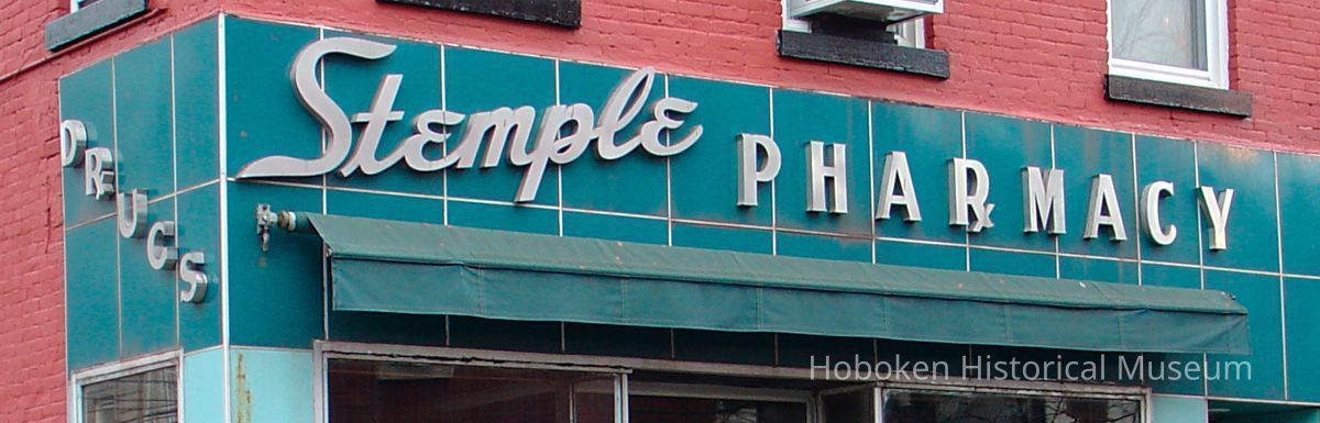 Stainless steel-lettered signage from the exterior of Stemple Pharmacy, 266 Seventh Street, Hoboken, no date, ca. 1950.