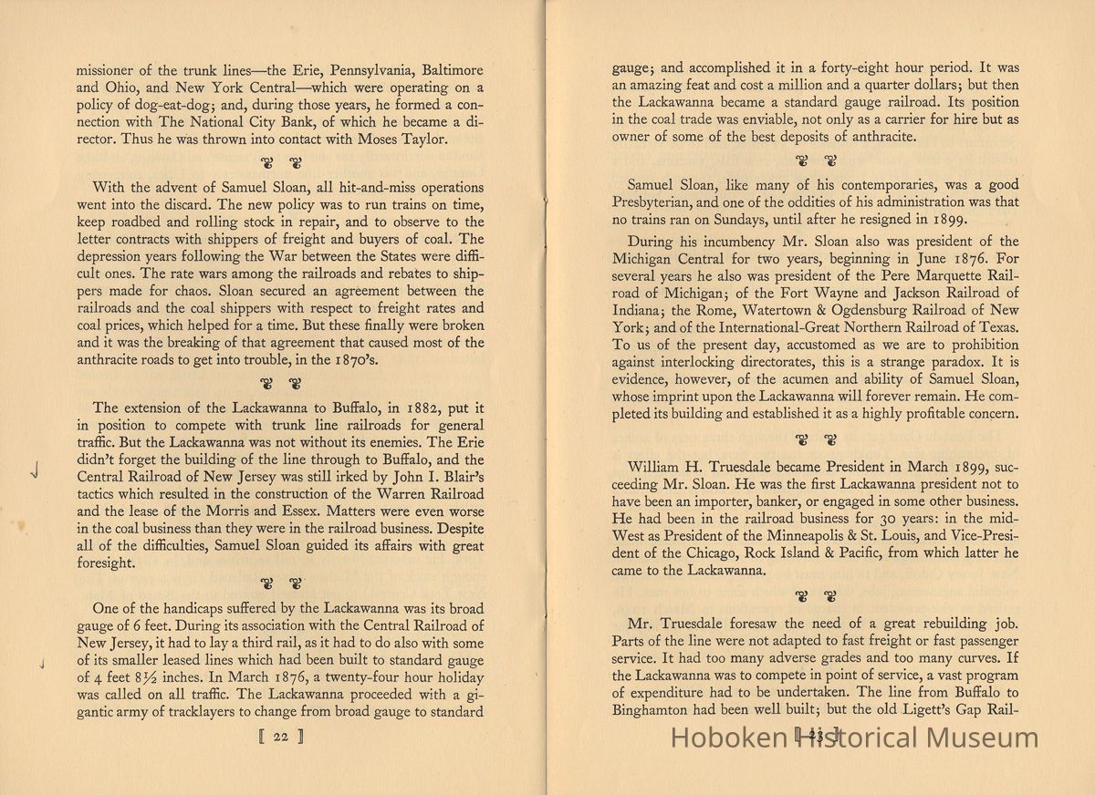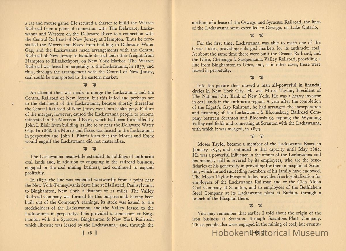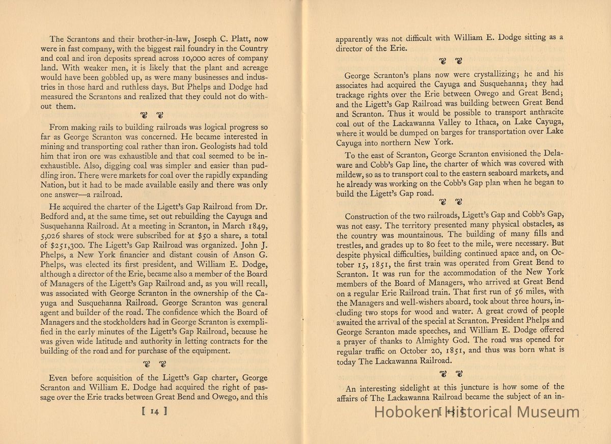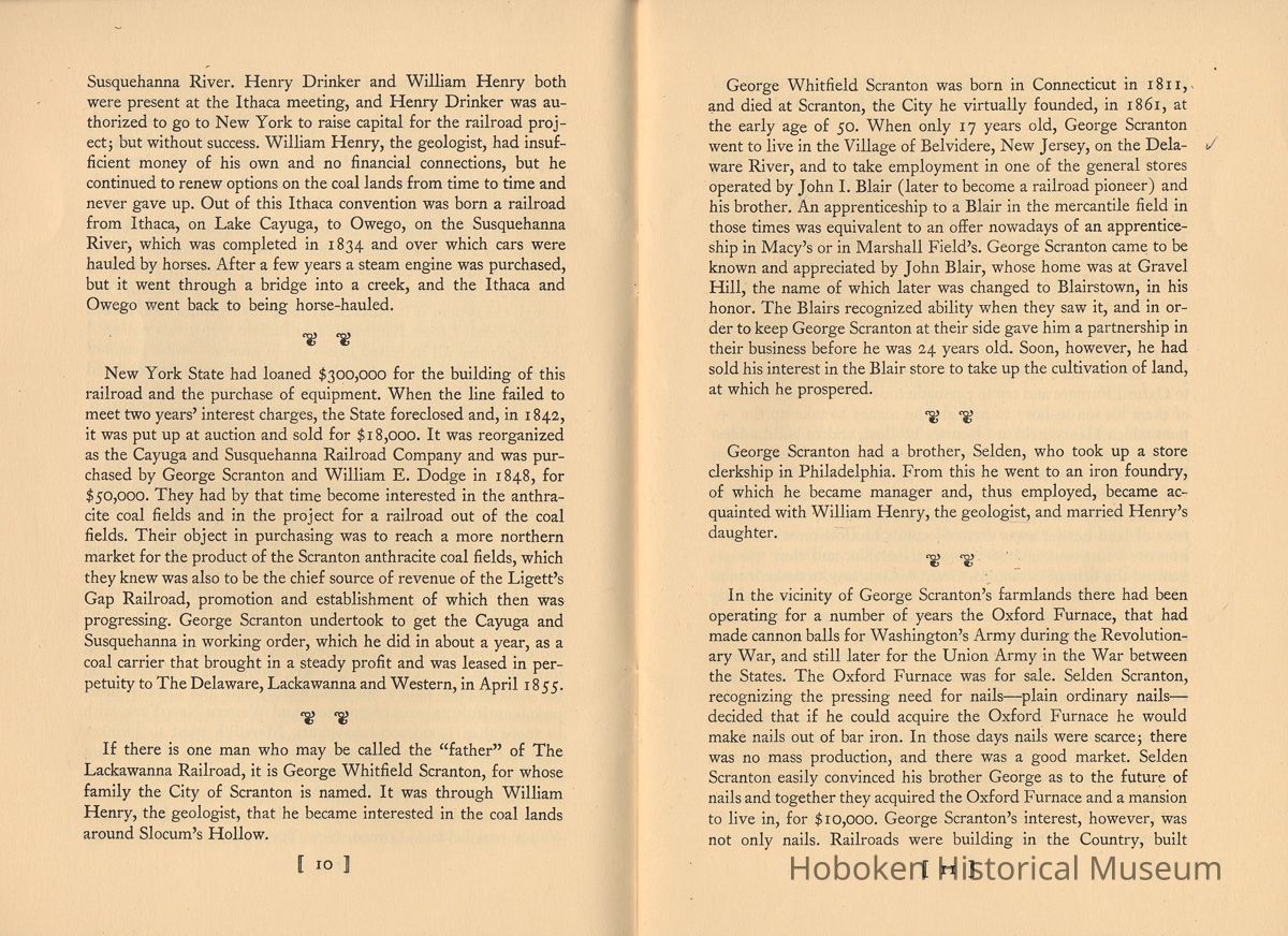 Notes: Selected text from Archives 2011.005.0251: The Lackawanna. "The Route of Phoebe Snow" 1851-1951. A Centenary Address. William White. Published by the Newcomen Society in North America, 1951. | 9 | Susquehanna River. Henry Drinker and William Henry both were present at the Ithaca meeting, and Henry Drinker was authorized to go to New York to raise capital for the railroad project but without success. William Henry, the geologist, had insufficient money of his own and no financial connections, but he continued to renew options on the coal lands from time to time and never gave up. Out of this Ithaca convention was born a railroad from Ithaca, on Lake Cayuga, to Owego, on the Susquehanna River, which was completed in 1834 and over which cars were hauled by horses. After a few years a steam engine was purchased, but it went through a bridge into a creek, and the Ithaca and Owego went back to being horse-hauled. - New York State had loaned $300,000 for the building of this railroad and the purchase of equipment. When the line failed to meet two years' interest charges, the State foreclosed and, in 1842, it was put up at auction and sold for $18,000. It was reorganized as the Cayuga and Susquehanna Railroad Company and was purchased by George Scranton and William E. Dodge in 1848, for $50,000. They had by that time become interested in the anthra- cite coal fields and in the project for a railroad out of the coal fields. Their object in purchasing was to reach a more northern market for the product of the Scranton anthracite coal fields, which they knew was also to be the chief source of revenue of the Ligett's Gap Railroad, promotion and establishment of which then was progressing. George Scranton undertook to get the Cayuga and Susquehanna in working order, which he did in about a year, as a coal carrier that brought in a steady profit and was leased in per- petuity to The Delaware, Lackawanna and Western, in April 1855. If there is one man who may be called the "father" of The Lackawanna Railroad, it is George Whitfield Scranton, for whose family the City of Scranton is named. It was through William Henry, the geologist, that he became interested in the coal lands around Slocum's Hollow. I 10 ] George Whitfield Scranton was born in Connecticut in 1811, and died at Scranton, the City he virtually founded, in 1861, at the early age of 50. When only 17 years old, George Scranton went to live in the Village of Belvidere, New Jersey, on the Dela- ware River, and to take employment in one of the general stores operated by John I. Blair (later to become a railroad pioneer) and his brother. An apprenticeship to a Blair in the mercantile field in those times was equivalent to an offer nowadays of an apprentice- ship in Macy's or in Marshall Field's. George Scranton came to be known and appreciated by John Blair, whose home was at Gravel Hill, the name of which later was changed to Blairstown, in his honor. The Blairs recognized ability when they saw it, and in or- der to keep George Scranton at their side gave him a partnership in their business before he was 24 years old. Soon, however, he had sold his interest in the Blair store to take up the cultivation of land, at which he prospered. - George Scranton had a brother, Selden, who took up a store clerkship in Philadelphia. From this he went to an iron foundry, of which he became manager and, thus employed, became ac- quainted with William Henry, the geologist, and married Henry's daughter. - In the vicinity of George Scranton's farmlands there had been operating for a number of years the Oxford Furnace, that had made cannon balls for Washington's Army during the Revolutionary War, and still later for the Union Army in the War between the States. The Oxford Furnace was for sale. Selden Scranton, recognizing the pressing need for nails-plain ordinary nails- decided that if he could acquire the Oxford Furnace he would make nails out of bar iron. In those days nails were scarce; there was no mass production, and there was a good market. Selden Scranton easily convinced his brother George as to the future of nails and together they acquired the Oxford Furnace and a mansion to live in, for $10.000. George Scranton's interest, however, was not only nails. Railroads were building in the Country, built I 11 I largely of strap rail. The crying need was for iron rail-the T rail - made then only in England and imported into this Country. - The Scrantons' operation of the Oxford Furnace was successful and their nails became well known. However, times were hard and payments were slow. They needed capital, but the banks would let them have money only if they could be taken in as partners. This the Scrantons would not do; rather, they turned to their friend, John I. Blair, and took him in as a partner, and partners they were in many later ventures. - The charter for the Ligett's Gap Railroad was held by Dr. Andrew Bedford, a country doctor, who renewed it every five years. Dr. Bedford advised William Henry, the geologist, to go to Oxford Furnace and try to persuade the Scranton brothers (one of them his son-in-law) to provide the money to take up the op- tions which Henry held at Slocum's Hollow, and to build a blast furnace. Iron was being made with anthracite coal in Wales and at Pottsville, Pennsylvania, so why not at Slocum's Hollow? Here was an opportunity for George Scranton to make iron rails. The brothers easily were persuaded. Philip H. Mattes, who owned a tract of land not far away from Slocum's Hollow on which were iron ore veins, was invited into a partnership, and thus was or- ganized the firm of Scrantons, Grant & Company to make iron at Slocum's Hollow. In 1842, the operation was successfully launched, but the orders for T-rails which George Scranton had counted on so heavily were not forthcoming. Other people were brought into the venture, including two cousins of the Scranton brothers, also named Scranton, who were businessmen of Augusta, 