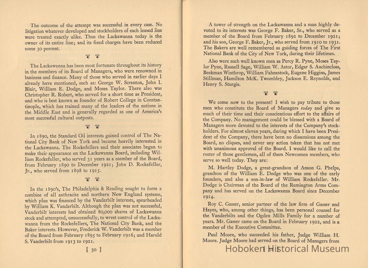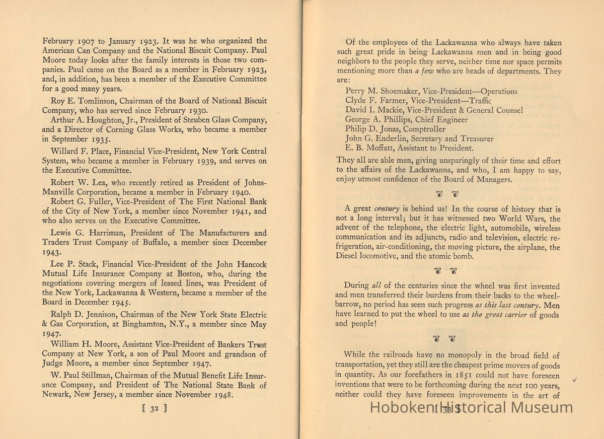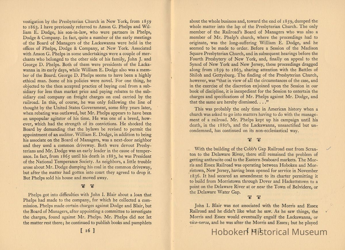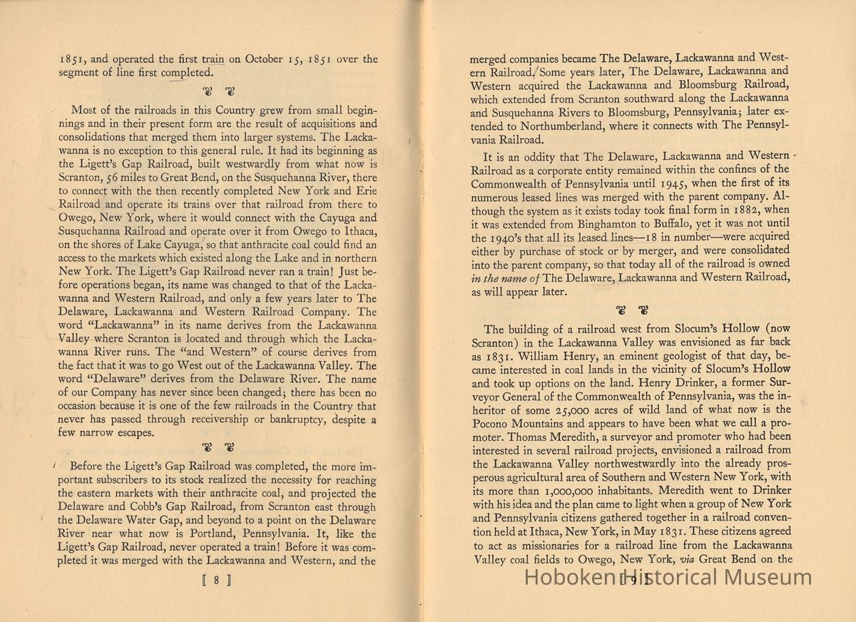 Notes: Selected text from Archives 2011.005.0251: The Lackawanna. "The Route of Phoebe Snow" 1851-1951. A Centenary Address. William White. Published by the Newcomen Society in North America, 1951. | 9 | Susquehanna River. Henry Drinker and William Henry both were present at the Ithaca meeting, and Henry Drinker was authorized to go to New York to raise capital for the railroad project but without success. William Henry, the geologist, had insufficient money of his own and no financial connections, but he continued to renew options on the coal lands from time to time and never gave up. Out of this Ithaca convention was born a railroad from Ithaca, on Lake Cayuga, to Owego, on the Susquehanna River, which was completed in 1834 and over which cars were hauled by horses. After a few years a steam engine was purchased, but it went through a bridge into a creek, and the Ithaca and Owego went back to being horse-hauled. - New York State had loaned $300,000 for the building of this railroad and the purchase of equipment. When the line failed to meet two years' interest charges, the State foreclosed and, in 1842, it was put up at auction and sold for $18,000. It was reorganized as the Cayuga and Susquehanna Railroad Company and was purchased by George Scranton and William E. Dodge in 1848, for $50,000. They had by that time become interested in the anthra- cite coal fields and in the project for a railroad out of the coal fields. Their object in purchasing was to reach a more northern market for the product of the Scranton anthracite coal fields, which they knew was also to be the chief source of revenue of the Ligett's Gap Railroad, promotion and establishment of which then was progressing. George Scranton undertook to get the Cayuga and Susquehanna in working order, which he did in about a year, as a coal carrier that brought in a steady profit and was leased in per- petuity to The Delaware, Lackawanna and Western, in April 1855. If there is one man who may be called the "father" of The Lackawanna Railroad, it is George Whitfield Scranton, for whose family the City of Scranton is named. It was through William Henry, the geologist, that he became interested in the coal lands around Slocum's Hollow. I 10 ] George Whitfield Scranton was born in Connecticut in 1811, and died at Scranton, the City he virtually founded, in 1861, at the early age of 50. When only 17 years old, George Scranton went to live in the Village of Belvidere, New Jersey, on the Dela- ware River, and to take employment in one of the general stores operated by John I. Blair (later to become a railroad pioneer) and his brother. An apprenticeship to a Blair in the mercantile field in those times was equivalent to an offer nowadays of an apprentice- ship in Macy's or in Marshall Field's. George Scranton came to be known and appreciated by John Blair, whose home was at Gravel Hill, the name of which later was changed to Blairstown, in his honor. The Blairs recognized ability when they saw it, and in or- der to keep George Scranton at their side gave him a partnership in their business before he was 24 years old. Soon, however, he had sold his interest in the Blair store to take up the cultivation of land, at which he prospered. - George Scranton had a brother, Selden, who took up a store clerkship in Philadelphia. From this he went to an iron foundry, of which he became manager and, thus employed, became ac- quainted with William Henry, the geologist, and married Henry's daughter. - In the vicinity of George Scranton's farmlands there had been operating for a number of years the Oxford Furnace, that had made cannon balls for Washington's Army during the Revolutionary War, and still later for the Union Army in the War between the States. The Oxford Furnace was for sale. Selden Scranton, recognizing the pressing need for nails-plain ordinary nails- decided that if he could acquire the Oxford Furnace he would make nails out of bar iron. In those days nails were scarce; there was no mass production, and there was a good market. Selden Scranton easily convinced his brother George as to the future of nails and together they acquired the Oxford Furnace and a mansion to live in, for $10.000. George Scranton's interest, however, was not only nails. Railroads were building in the Country, built I 11 I largely of strap rail. The crying need was for iron rail-the T rail - made then only in England and imported into this Country. - The Scrantons' operation of the Oxford Furnace was successful and their nails became well known. However, times were hard and payments were slow. They needed capital, but the banks would let them have money only if they could be taken in as partners. This the Scrantons would not do; rather, they turned to their friend, John I. Blair, and took him in as a partner, and partners they were in many later ventures. - The charter for the Ligett's Gap Railroad was held by Dr. Andrew Bedford, a country doctor, who renewed it every five years. Dr. Bedford advised William Henry, the geologist, to go to Oxford Furnace and try to persuade the Scranton brothers (one of them his son-in-law) to provide the money to take up the op- tions which Henry held at Slocum's Hollow, and to build a blast furnace. Iron was being made with anthracite coal in Wales and at Pottsville, Pennsylvania, so why not at Slocum's Hollow? Here was an opportunity for George Scranton to make iron rails. The brothers easily were persuaded. Philip H. Mattes, who owned a tract of land not far away from Slocum's Hollow on which were iron ore veins, was invited into a partnership, and thus was or- ganized the firm of Scrantons, Grant & Company to make iron at Slocum's Hollow. In 1842, the operation was successfully launched, but the orders for T-rails which George Scranton had counted on so heavily were not forthcoming. Other people were brought into the venture, including two cousins of the Scranton brothers, also named Scranton, who were businessmen of Augusta, 