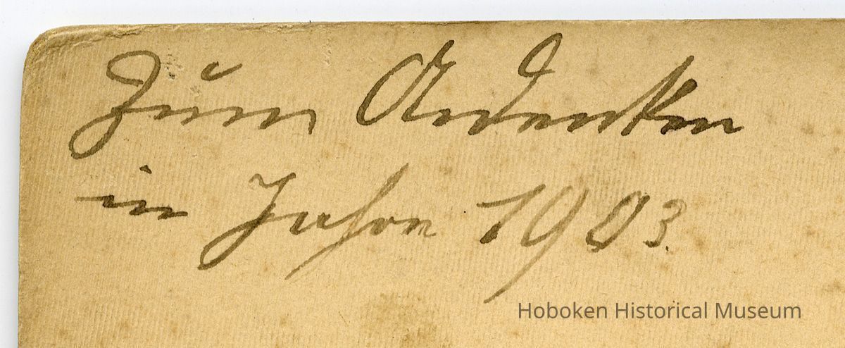 Photographer's mount, 4-5/16" wide x 6-7/16" high; beveled-edge (gold paint). Photo taken by A[drian]. Van Kampen, 306 Washington St., Hoboken. Reverse has contemporary ink notation at upper right with name of person not legible with date below.