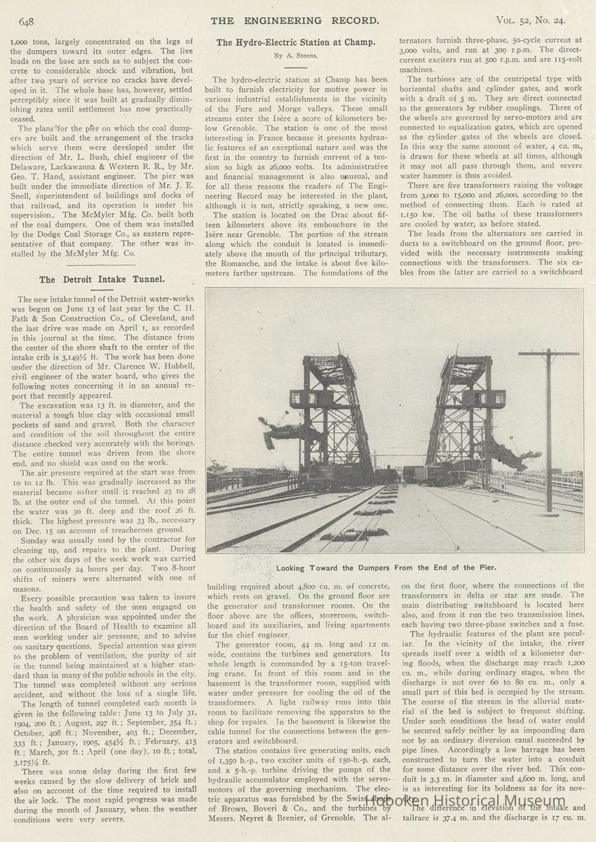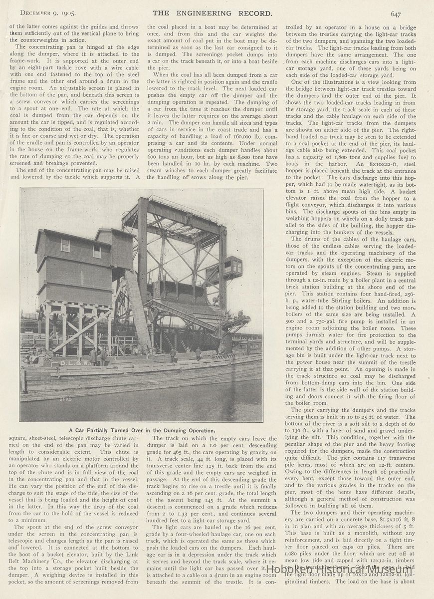Notes: Archives 2012.007.0054. The Engineering Record, Volume 52, No. 24, Dec. 9, 1905, pages 646-648. Full text of this article only. [caption for photo above article title] Looking toward the Dumpers from the Bridge between Light-Car Tracks. COAL HANDLING PLANT AT THE HOBOKEN TERMINAL OF THE LACKAWANNA R. R. The Delaware, Lackawanna & Western R. R. has installed two McMyler car dumping machines in its terminal yards at Hoboken, N. J., which are the only machines of this type in operation at tide water. A large amount of the heavy coal traffic carried by the Lackawanna from the anthracite coal fields of Pennsylvania is brought to its eastern terminus at Hoboken. From the terminal the coal is carried by various types of water craft to all parts of New York harbor, and in long tows to places along_the coast, particularly to Boston. The Lackawanna has an extensive terminal area at Hoboken, but the heavy traffic that is tributary to it keeps its facilities congested at all times and requires every possible economy of space in order that this traffic may be handled properly. The two car dumpers, the arrangement of the tracks which serve them and of the loaded-car and light-car yards built in connection with them permit a much greater amount of coal to be handled than could be taken care of on any type of gravity-dumping piers occupying the same space. The car dumpers are on a pile and timber pier, extending 1,270 ft. into the North River from the bulkhead line. They are built on a heavy concrete base erected on a pile foundation, the transverse center line of the base being 645 ft. outside the bulkhead line. The pier is cigar-shaped in plan, 60 ft. wide at the outer end, 116 ft. wide at the center line of the dumpers, and 72 ft. wide at the.inner end. The general arrangement of the dumpers and the tracks which serve them is shown in the accompanying illustrations. An arrangement of grades on these tracks, together with a system of cable haulage, are employed which avoids any necessity of locomotives on the pier. This greatly facilitates the handling' of cars, and at the same time permitted a more suitable lay-out of the car storage yards used in connection with the dumpers. The loaded-car storage yard has a capacity of 500 cars and is immediately back of the shore end of the pier. It has 14 tracks and is laid out symmetrically on each side of the projected center line of the pier, with a diagonal ladder track on each side of the yard. The ladder tracks join a track on each side of the center line of the yard, these two middle tracks being continued out on the pier. The yard is laid out for gravity operation, its tracks all being on a 1.33 per cent descending grade approaching the pier. This grade is maintained to within 50 ft. of the bulkhead line, where it is reduced to 1.0 per cent., the tracks descending at that rate for about 95 ft. out on the pier. One of these tracks is on each side of the transverse center line of the pier. A 44-ft. car-weighing scale, with its transverse center line 135 ft. from the bulkhead line, is placed in each of these two tracks leading in from the loaded-car storage yard. Between the shore end of each scale and the outer end of the portion of these tracks on the 1.0 per cent, grade the track grade is gradually reduced until the tracks become level. This arrangement of grades reduces the speed of the cars dscending by gravity from the storage yard until they pass over the scales slowly enough to be weighed while moving and then come to a stop just beyond the The two loaded-car tracks are level for 400 feet from the end of the scales nearly to the outer end of the dumpers. Provision is thus made for the temporary storage of several cars to each track, avoiding any delay in the supply of cars to the dumpers. After the cars lose their momentum and come to a stop on the level track beyond the scales they are handled over the tracks on the balance of the pier by cable haulage. A short piece of cable, with a grip on one end by which it is attached to the haulage cable and a hook on the other end which may be attached to any of the projections on the side of the car, is used in moving the cars. Just beyond the dumpers a turnout connects each of the loaded-car tracks with a track parallel to it along the outer edge of the pier. Each of the loaded-car tracks is on an ascending grade for about 100 ft. from the end of the level stretch in it at its dumper. The turnouts are also on a descending grade which is increased to 1.4 per cent. The tracks wtih which the turnouts connect on the outer edges of the pier end about two fear lengths beyond these connections, their rails (being curved up nearly to the vertical at the end to prevent cars from running over. This arrangement of the tracks supplying the dumpers with loaded cars makes the handling of the latter comparatively easy. After the cars have been weighed and have come to rest on either of the level tracks between the dumpers and the scales they are moved along by attaching one of the pieces of cable, with a grip on one end and a hook on the other, to either of the haulage cables on each side of the track and to the car. The haulage cable on the outside of both loaded-car tracks ends at the dumpers. One of those on the inside ends just beyond the dumpers, but the other one continues to the end of the pier. The cars get sufficient momentum from the haulage to carry them to the beginning of the grade at the dumper and then continue by gravity on the turnout to the end of the outer tracks. This outer track on each side of the pier ascends on a 1.4 per cent, and then a 4.23 per cent, grade to the dumper it serves. The cars are pushed up this grade to the dumper by a heavy four-wheeled haulage car which runs on rails gauntleted between those of the standard-gauge track. This haulage car when at rest is against a bumping block in a depression at the end of the track and is attached to a cable operated on drums in an engine r