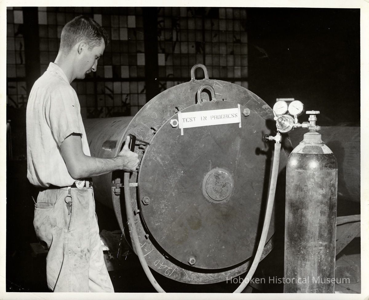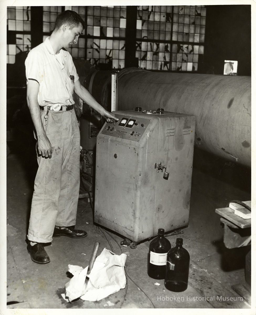 B+W photos, 3, of on-site helium leak test at M.W. Kellogg in Jersey City by United States Testing Co., Hoboken. N.d., ca. 1970s or 1980s.