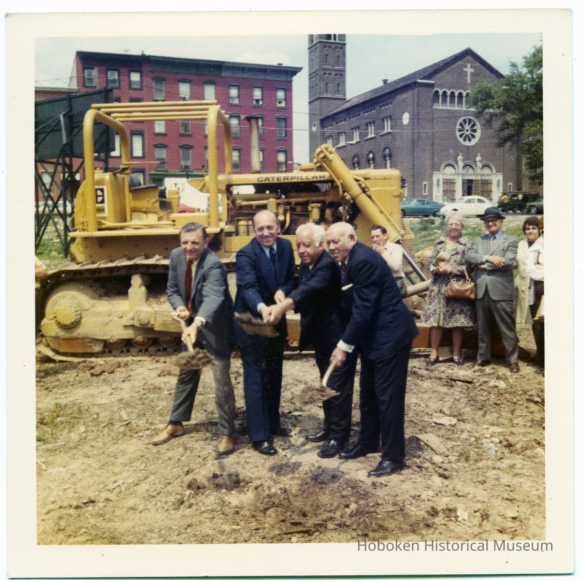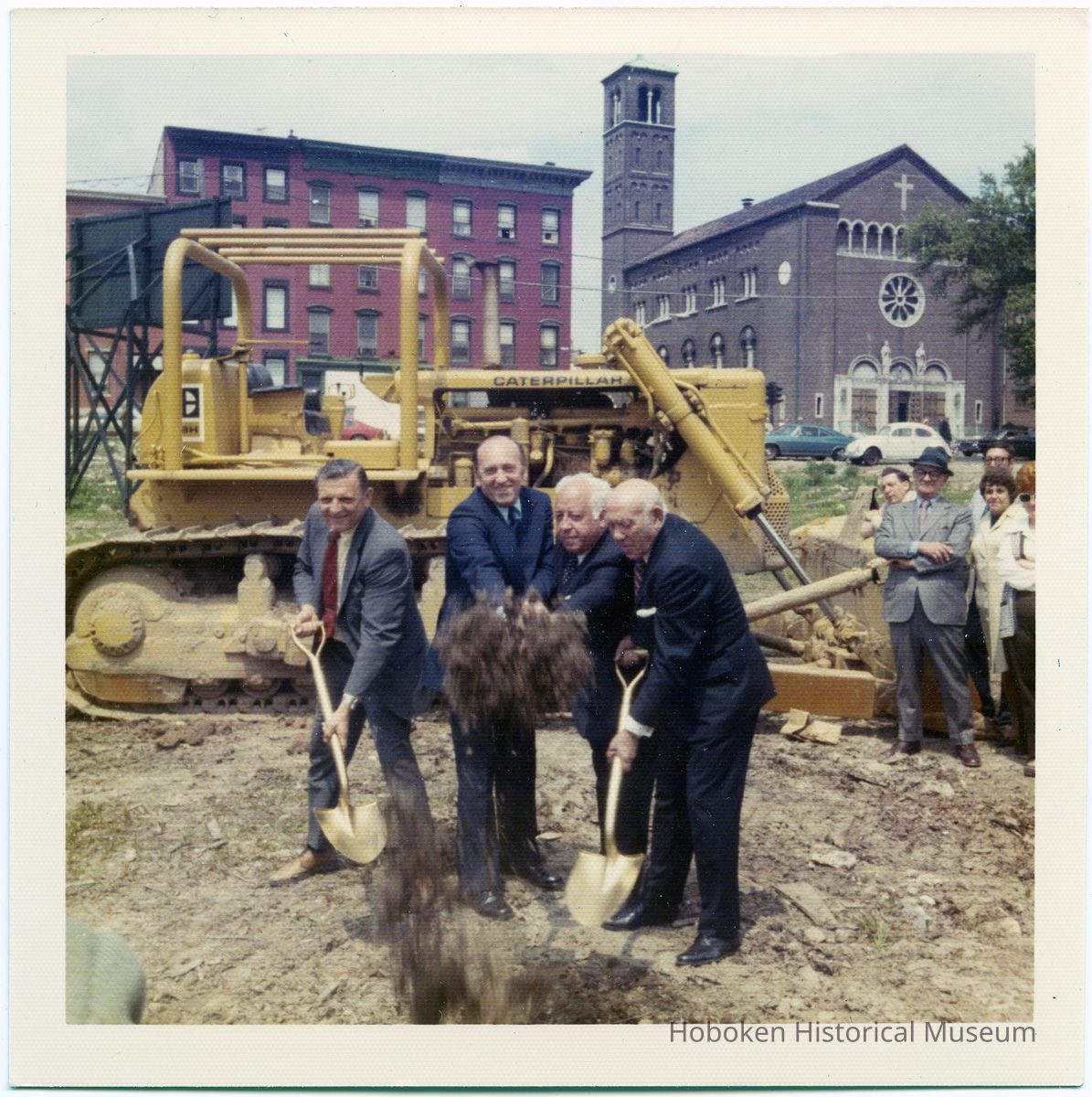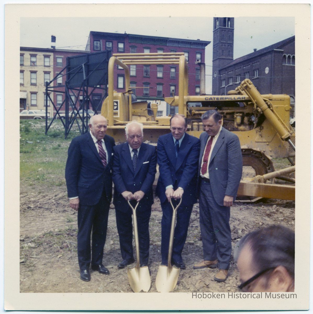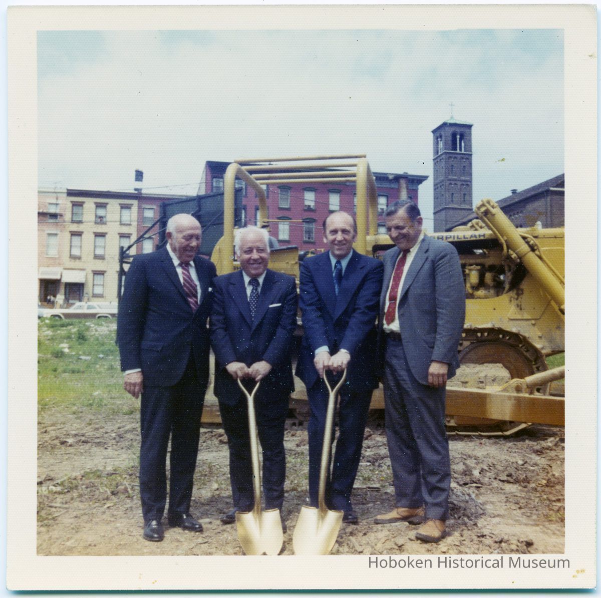 Photos 2 and 3: four men posed before groundbreaking with two gold-plated shovels; holding shovels: (left) Louis DePascale (President, Hoboken City Council); to his left: Mayor Steve Cappiello; other two men not identified; view is northwest with Saints Peter & Paul Church in background (at northwest corner of Hudson and Fourth Streets.)