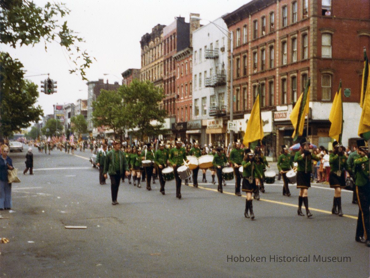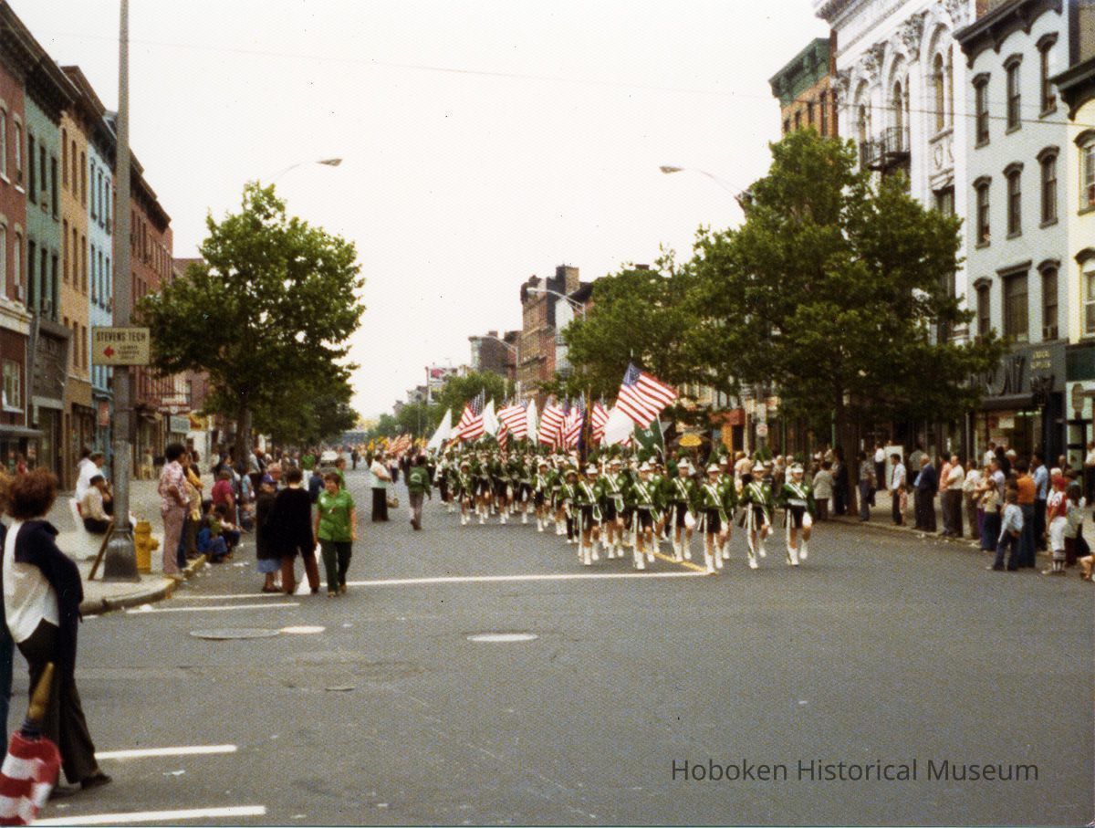 Photo 1: view southwest on Washington Street to intersection of Fifth Street; Hoboken High School marching unit is just crossing Fifth Street with banner, cheerleaders or pep squad leading the way; buildings in 400 block are seen. Reverse numbered 8.