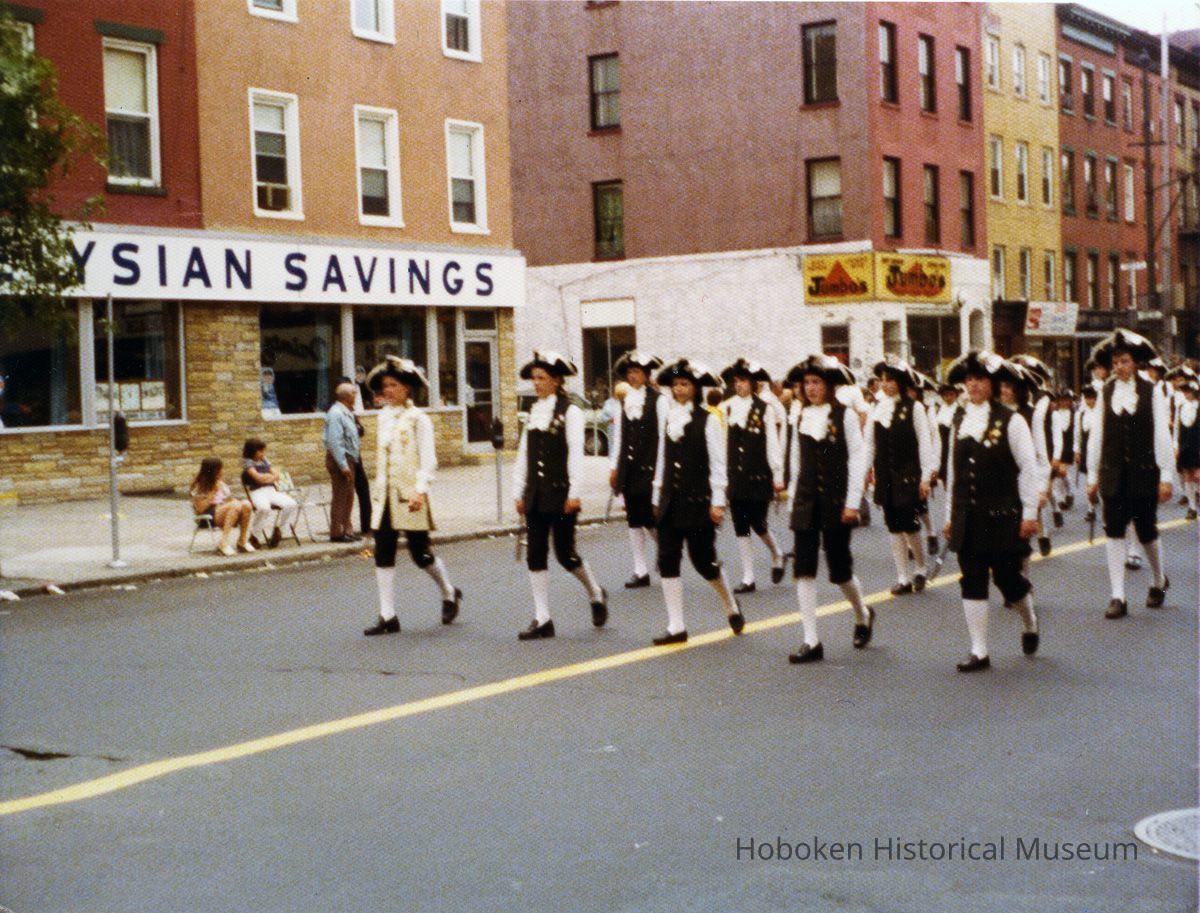 Photo 3: view southeast on Washington Street to corner of Fourth St. (left: Elysian Savings, 401 Washington St.); a fife corps (appears to be all boys) in colonial costume is heading north. Reverse numbered 19.
