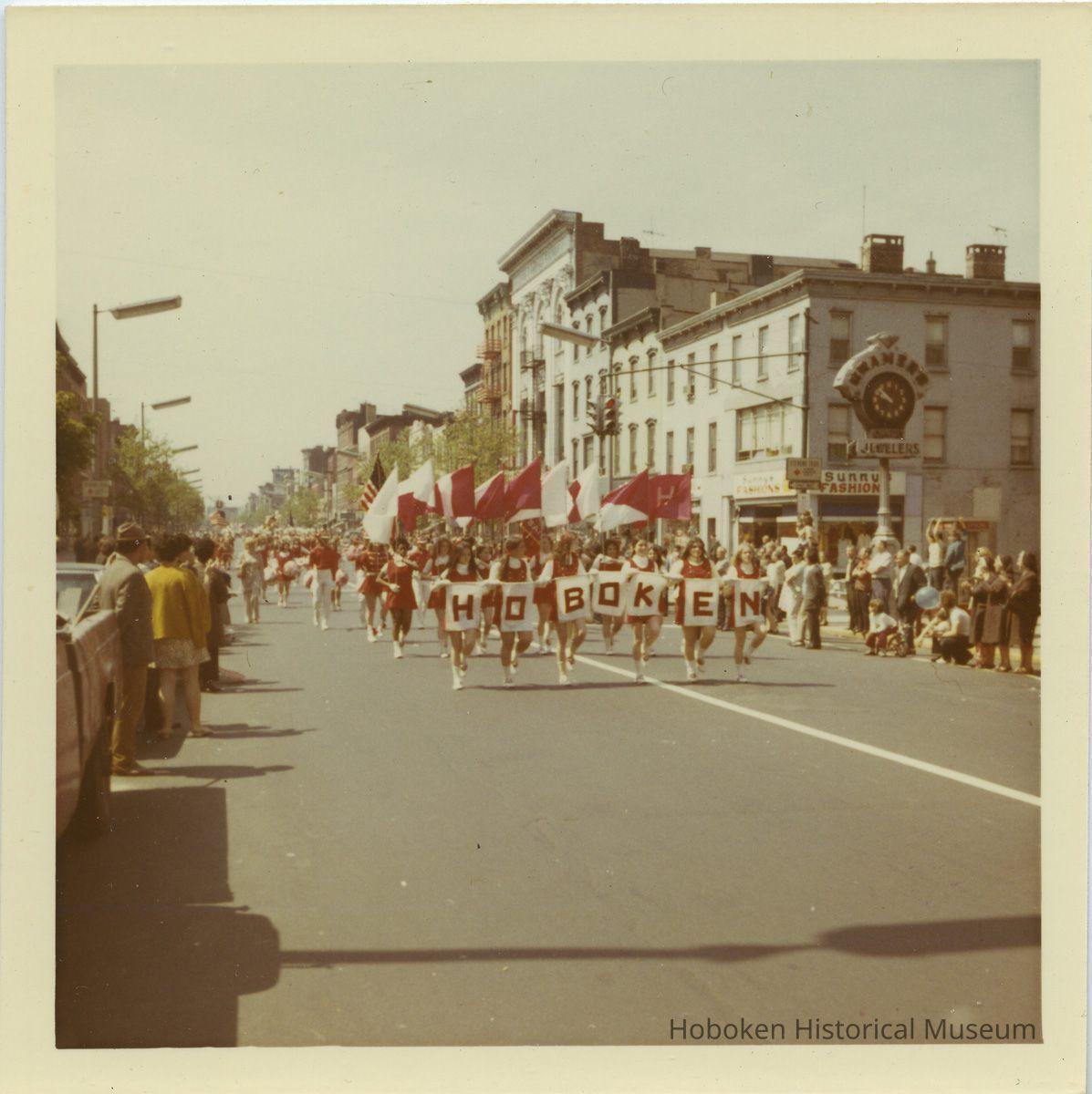 Color photograph of a Hoboken High School marching unit in a parade on Washington St., Hoboken, n.d., ca. 1970-1975.