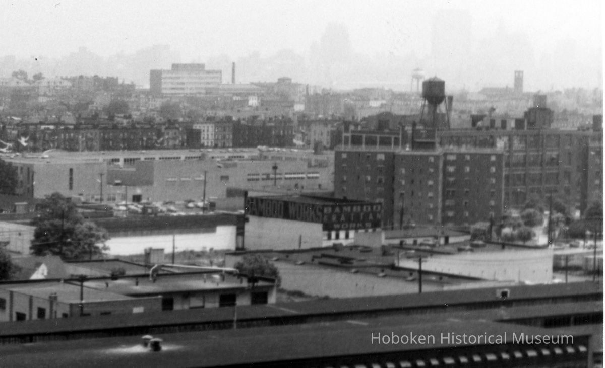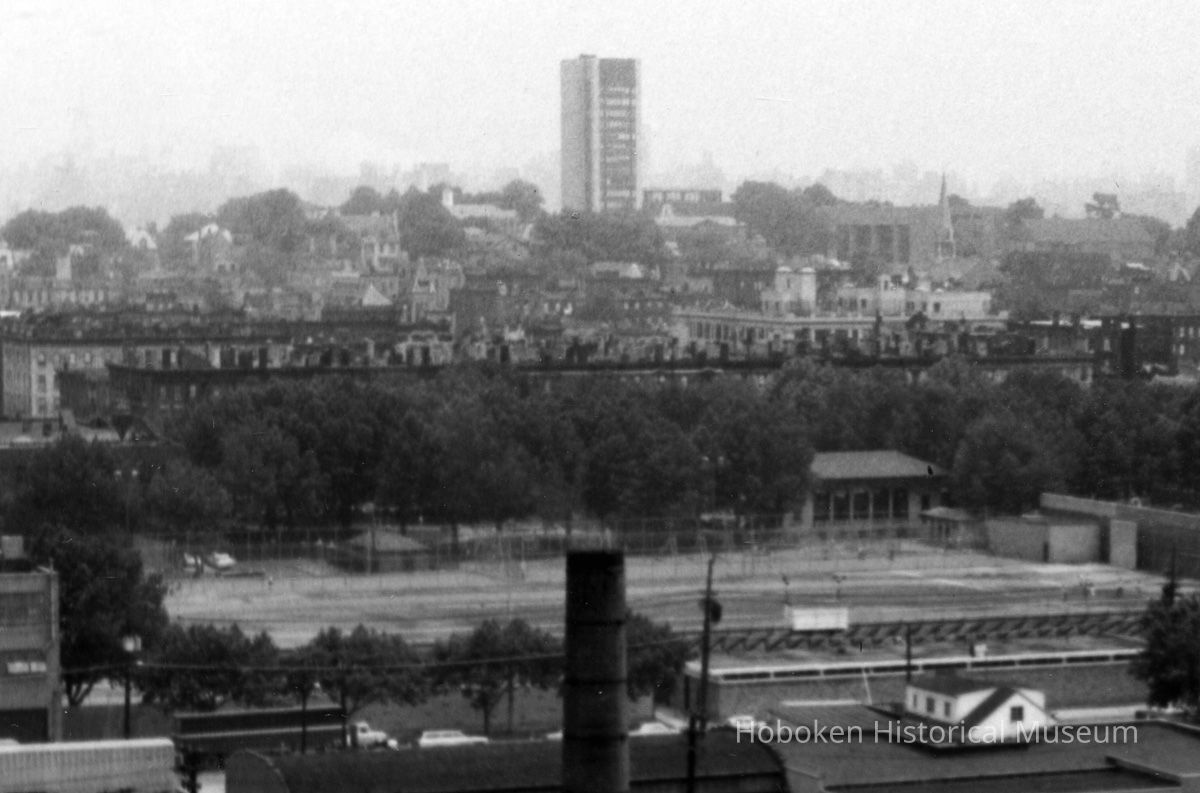 B+W photo of view looking southeast of factory buildings on Monroe & Jefferson Sts. from 10th St.; Veterans Field, Columbus Park, Hoboken, n.d., ca. 1969-1970.