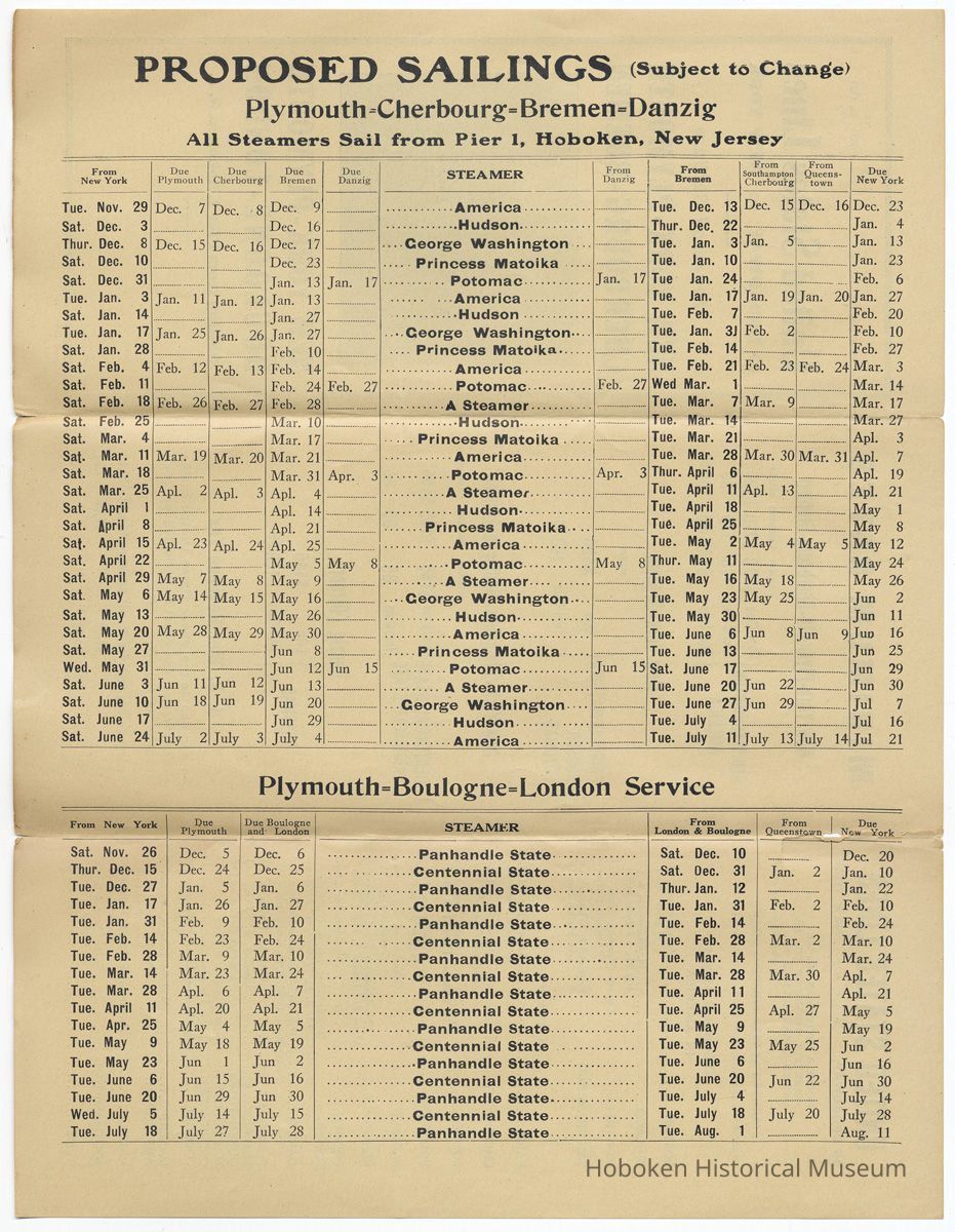 Notes: [side 1, right panel - cover as folded] SAILING LIST NO. 4 NOV. 26, 1921 United States Lines 45 BROADWAY NEW YORK Proposed Sailings NEW YORK - PLYMOUTH CHERBOURG - BREMEN NEW YORK - PLYMOUTH BOULOGNE - LONDON Sailing from Pier 1, Hoboken, N. J. Form 3 10M-11-21 [end side 1, right panel - cover as folded] [side 1, center panel] MINIMUM RATES New York-Plymouth-Cherbourg-Bremen ---------------------------------------------------PLYMOUTH CHERBOURG BREMEN Geo. Washington First Class $220 $220 $220 America Second Class 125 130 130 Third Class 87.50 90 103.50 New York-Bremen ------------------------------------------------------------Bremen PRINCESS MATOIKA Cabin $130 HUDSON Third Class 103.50 POTOMAC New York - Plymouth - Boulogne - London ----------------------------------------------------PLYMOUTH BOULOGNE LONDON CENTENNIAL STATE First Class $195 $195 $195 PANHANDLE STATE Third Class 85 90 85 Danzig (Direct) POTOMAC Cabin $145 Third Class 106.50 U. S. War Revenue Tax In addition to the above Rates United States War Revenue Tax must be collected on each passage as follows: Passage costing over $10.00 not exceeding $30.00 $1.00 " " 30.00 " " 60.00 3.00 " " 60.00 5.00 [end side 1, center panel] Status: OK Status By: dw Status Date: 2012-05-10