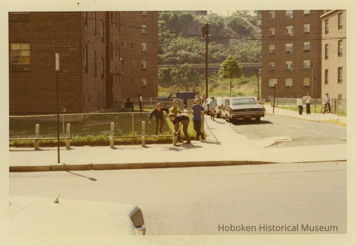 Color photo of exterior of Andrew Jackson Gardens, 314 & 320 Harrison St., Hoboken, n.d., ca. 1968-1972.
