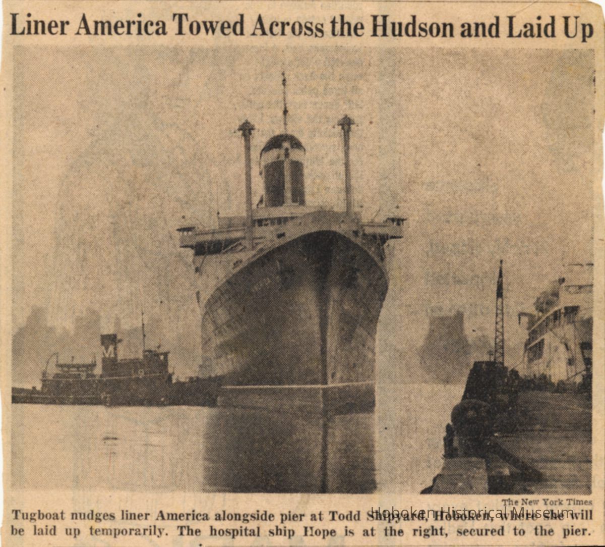 Article: Liner America is Towed Across the Hudson and Laid Up. NYT, Sept. 29, 1953. With two other articles.
