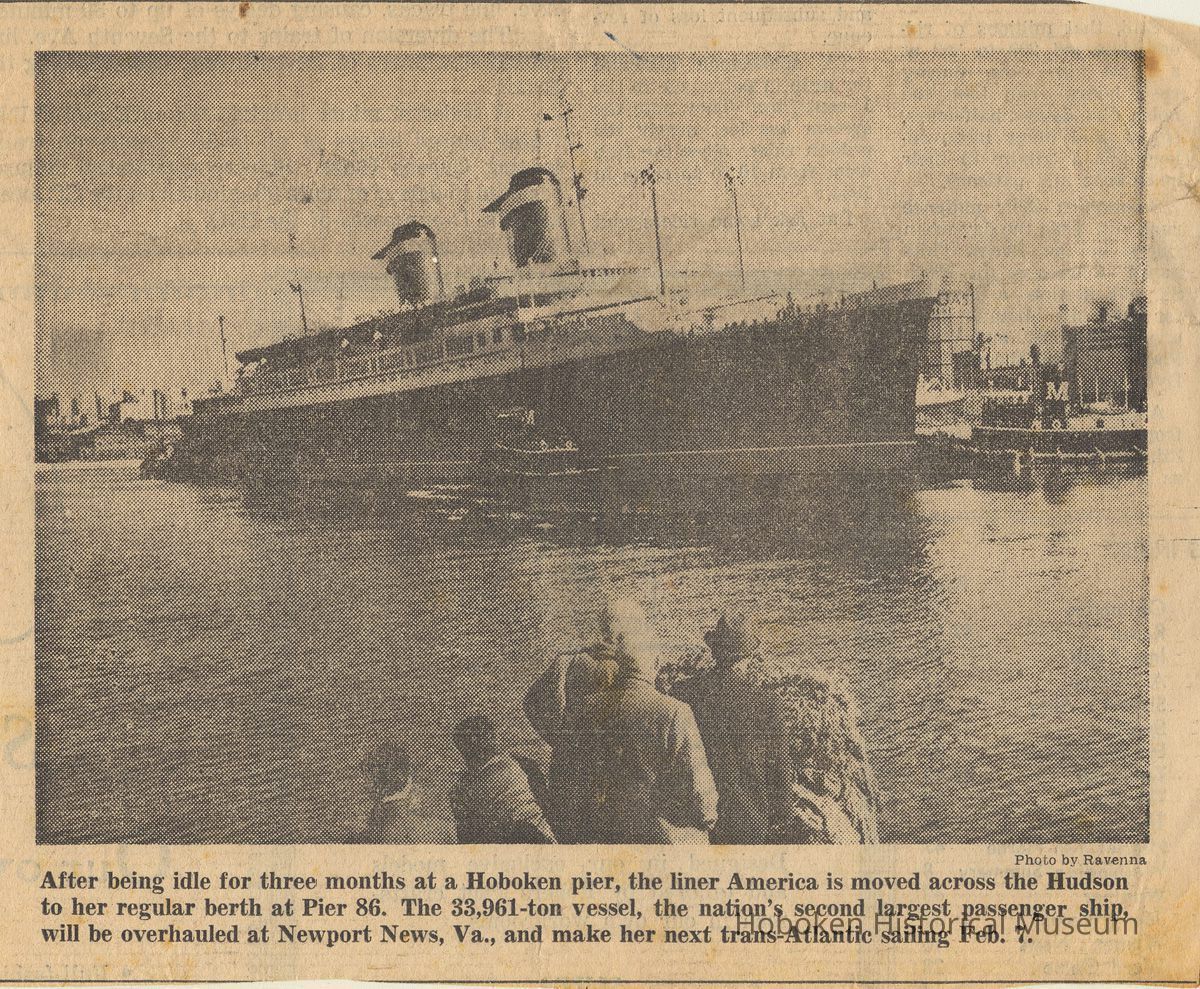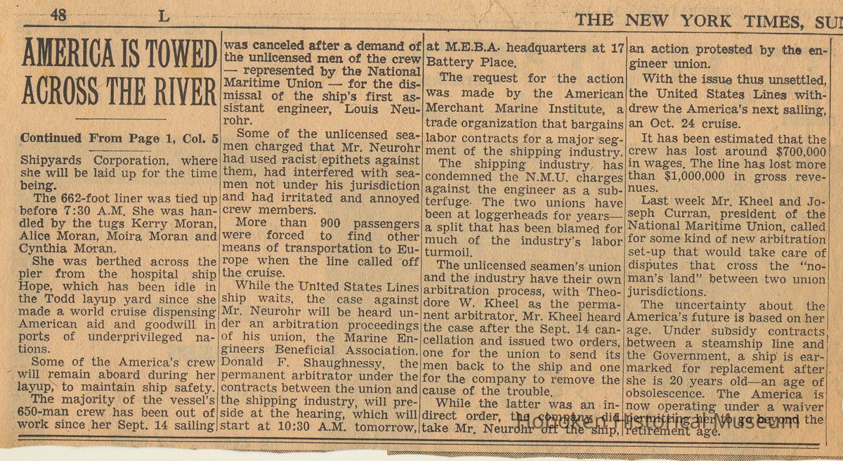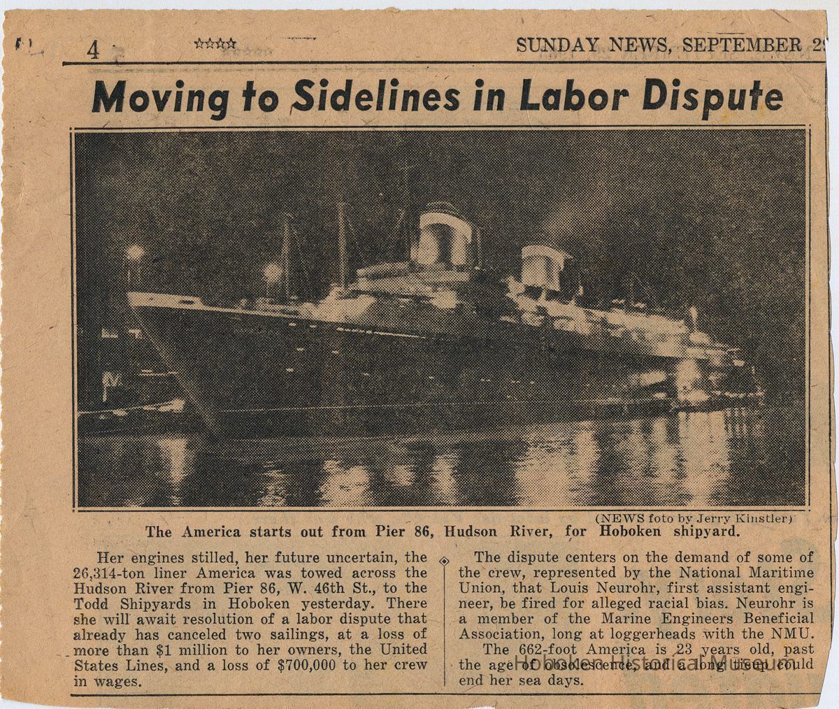 Notes: 2012.001.0033. Article 1: The New York Times, Sunday, September 29, 1963 Liner America Towed Across the Hudson and Laid Up [caption] Tugboat nudges liner America alongside pier at Todd Shipyard, Hoboken, where she will be laid up temporarily. The hospital ship Hope is at the right, secured to the pier. By GEORGE HORNE Moving as a "dead" ship, with her engines stilled, the 26,314-ton liner America was towed across the Hudson River to Hoboken yesterday to await a decision over a labor dispute. Two of her voyages have already been canceled, and her future is uncertain. Pour tugs of the Moran Towing and Transportation Company began placing lines aboard the ship at Pier 86 just after dawn, and towed her across before harbor traffic began to clutter the river. With only a small stand-by crew aboard, the 23-year-old liner was nudged into the north side of Pier J in the Hoboken plant of the Todd Continued on Page 48, Column 1 48 THE NEW YORK TIMES, SUN[DAY, SEPTEMBER 29, 1963.] AMERICA IS TOWED ACROSS THE RIVER Continued From Page 1, Col. 5 Shipyards Corporation, where she will be laid up for the time being. The 662-foot liner was tied up before 7:30 A.M. She was handled by the tugs Kerry Moran, Alice Moran, Moira Moran and Cynthia Moran. She was berthed across the pier from the hospital ship Hope, which has been idle in the Todd layup yard since she made a world cruise dispensing American aid and goodwill in ports of underprivileged nations. Some of the America's crew will remain aboard during her layup, to maintain ship safety. The majority of the vessel's 650-man crew has been out of work since her Sept. 14 sailing was canceled after a demand of the unlicensed men of the crew — represented by the National Maritime Union — for the dismissal of the ship's first assistant engineer, Louis Neurohr. Some of the unlicensed seamen charged that Mr. Neurohr had used racist epithets against them, had interfered with seamen not under his jurisdiction and had irritated and annoyed crew members. More than 900 passengers were forced to find other means of transportation to Europe when the line called off the cruise. While the United States Lines ship waits, the case against Mr. Neurohr will be heard under an arbitration proceedings of his union, the Marine Engineers Beneficial Association. Donald F. Shaughnessy, the permanent arbitrator under the contracts between the union and the shipping industry, will preside at the hearing, which will start at 10:30 A.M. tomorrow, at M.E.B.A. headquarters at 17 Battery Place. The request for the action was made by the American Merchant Marine Institute, a trade organization that bargains labor contracts for a major segment of the shipping industry. The shipping industry,, has condemned the N.M.U. charges against the engineer as a subterfuge- The two unions have been at loggerheads for years— a split that has been blamed for much of the industry's labor turmoil. The unlicensed seamen's union and the industry have their own arbitration process, with Theodore W. Kheel as the permanent arbitrator. Mr. Kheel heard the case after the Sept. 14 cancellation and issued two orders, one for the union to send its men back to the ship and one for the company to remove the cause of the trouble. While the latter was an indirect order, the company did take Mr. Neurohr off the ship, an action protested by the engineer union. With the issue thus unsettled, the United States Lines withdrew the America's next sailing, an Oct. 24 cruise. It has been estimated that the crew has lost around $700,000 in wages. The line has lost more than $1,000,000 in gross revenues. Last week Mr. Kheel and Joseph Curran, president of the National Maritime Union, called for some kind of new arbitration set-up that would take care of disputes that cross the "no-man's land" between two union jurisdictions. The uncertainty about the America's future is based on her j age. Under subsidy contracts; between a steamship line and the Government, a ship is earmarked for replacement after she is 20 years old—an age of obsolescence. The America is now operating under a waiver permitting her to go beyond the retirement age. [end article 1] ---- Article 2: Sunday News (Daily News), Sunday, September 29, 1963 4 Sunday News, September 29, 1963 Moving to Sidelines in Labor Dispute (NEWS foto by Jerry Kinstler) [caption] The America starts out from Pier 86, Hudson River, for Hoboken shipyard. Her engines stilled, her future uncertain, the 26,314-ton liner America was towed across the Hudson River from Pier 86, W. 46th St., to the Todd Shipyards in Hoboken yesterday. There she will await resolution of a labor dispute that already has canceled two sailings, at a loss of more than $1 million to her owners, the United States Lines, and a loss of $700,000 to her crew in wages. The dispute centers on the demand of some of the crew, represented by the National Maritime Union, that Louis Neurohr, first assistant engineer, be fired for alleged racial bias. Neurohr is a member of the Marine Engineers Beneficial Association, long at loggerheads with the NMD. The 662-foot America is 23 years old, past the age of obsolescence, and a long tieup could end her sea days. [end article 2] Article 3: (New York World-Telegram and Sun), ca. late Dec. 1963. Photo by Ravenna After being idle for three months at a Hoboken pier, the liner America is moved across the Hudson to her regular berth at Pier 86. The 33,961-ton vessel, the nation's second largest passenger ship, will be overhauled at Newport News, Va., and make her next trans-Atlantic sailing Feb. 7. [end article 3] Status: OK Status By: dw Status Date: 2012-05-29