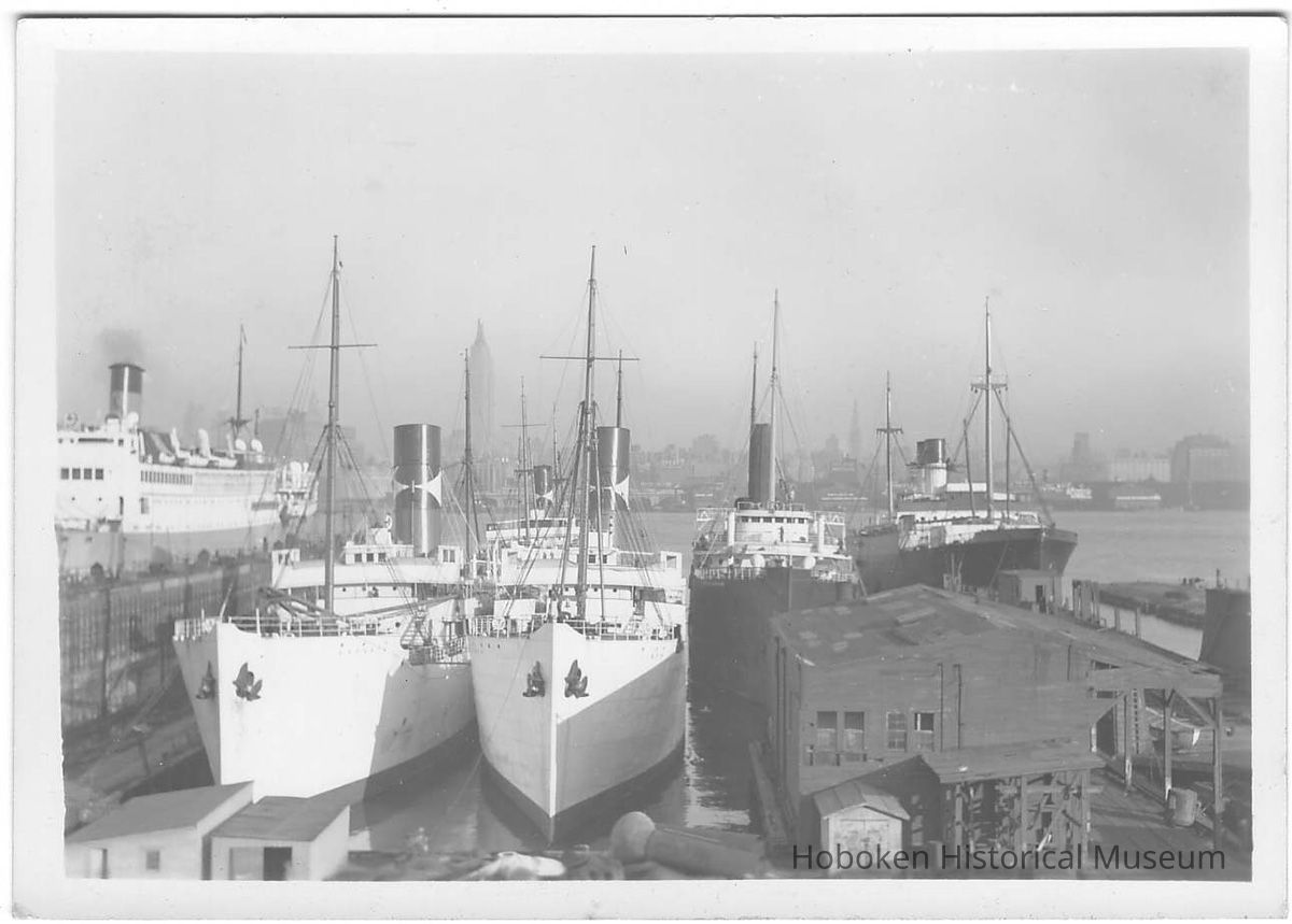 B+W photo of 4 ships at berth and one in a dry dock, Hoboken, no date, ca. 1940.