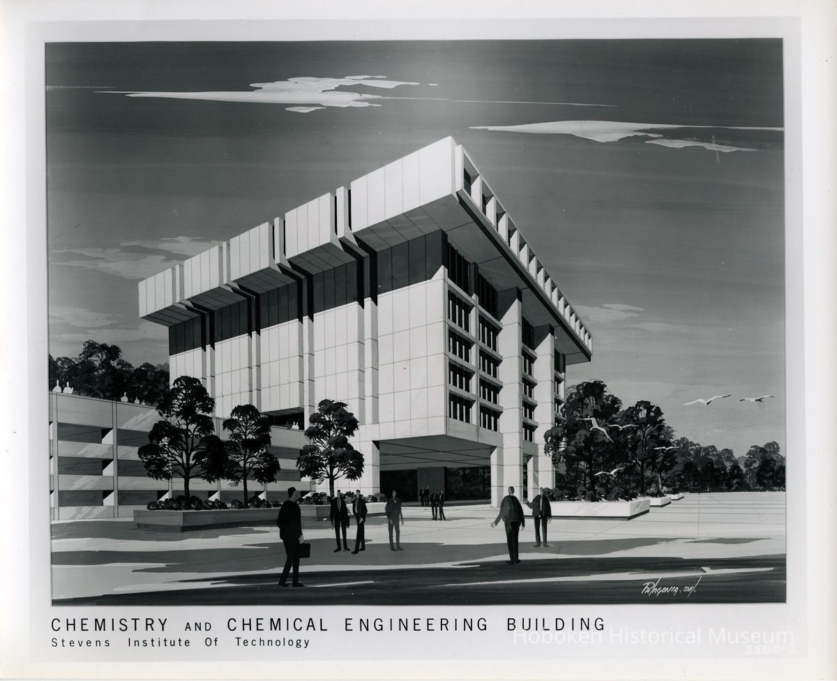Black-and-white photographs, five, of architectural renderings for proposed buildings designed for Stevens Institute of Technology campus, Hoboken, dated Sept. 27, 1967.