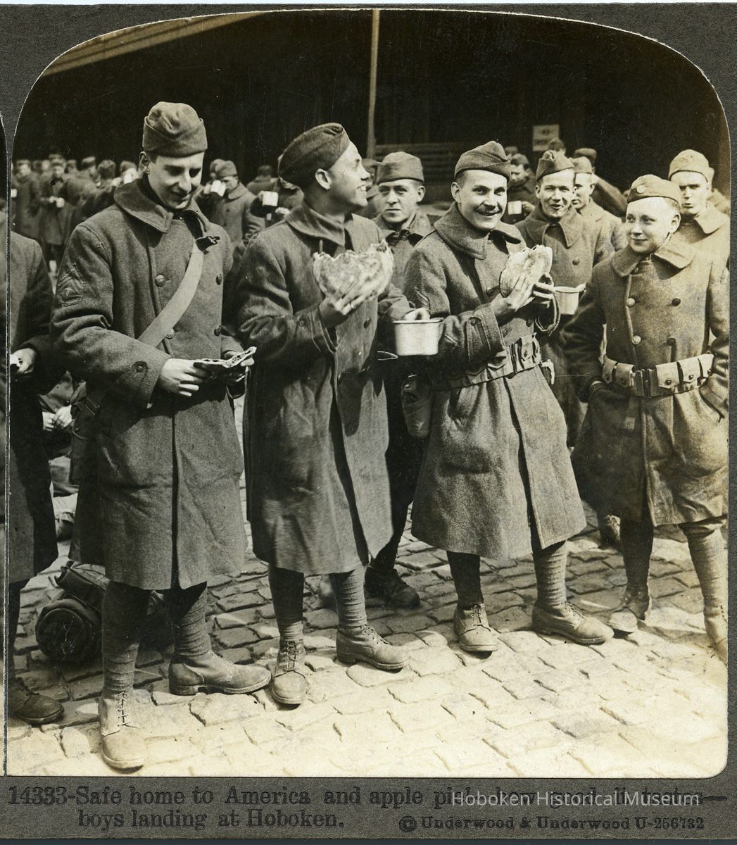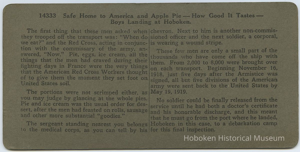 Notes: 2013.001.0050, printed text on back of stereoview: 14333 Safe home to America and apple pie! - how good it tastes - boys landing in Hoboken. The first thing that these men asked when they trooped off the transport was: "When do-we eat?" and the Red Cross, acting in conjunction with the commissary of the army, answered, "Now." Pie, eggs, ice cream, all the things that the men had craved during their fighting days in France were the very things that the American Red Cross Workers thought of to give them the moment they set foot on United States soil. The portions were not scrimped either, as you may judge by glancing at the whole pies. Pie and ice cream was the usual order for dessert, after the men had feasted on rolls, sausage and other more substantial "goodies." The sergeant standing nearest you belongs to the medical corps, as you can tell by his chevron. Next to him is another non-commissioned officer and the next soldier, a corporal, is wearing a wound stripe. These few men are only a small part of the thousands who have come off the ship with them. From 2,000 to 8,000 were brought over on each transport. Beginning November 16, 1918, just five days after the Armistice was signed, all but five divisions of the American army were sent back to the United States by May 19, 1919. No soldier could be finally released from the service until he had both a doctor's certificate and his honorable discharge, and this meant that he must go from the port where he landed, Hoboken in this case, to a debarkation camp for this final inspection. Original or Copy: Original Status: OK Status By: dw Status Date: 2013-11-18