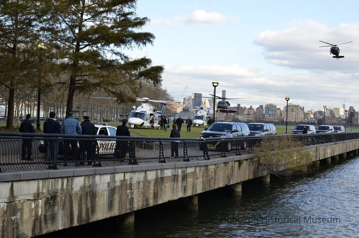 Notes: Photographer's 2013 comments: I was walking around looking for interesting things to shot. I just so happened to be walking along the river when a mass of black suvs and state police pulled up and blocked off the pier. I knew from walking along Washington St that media outlets where setting up for a press conference and they expected Gov. Chris Christie. I was one of only a few people down by the pier and I did not see any news camera men. I only had My 35mm lens with me and I was set back far from the action. I decided to shoot anyways and lucky for me I got a few good shots. I did have to crop this one far which led me to convert it to black and what to preserve viewing quality. Original or Copy: Original Status: OK Status By: dw Status Date: 2013-12-05