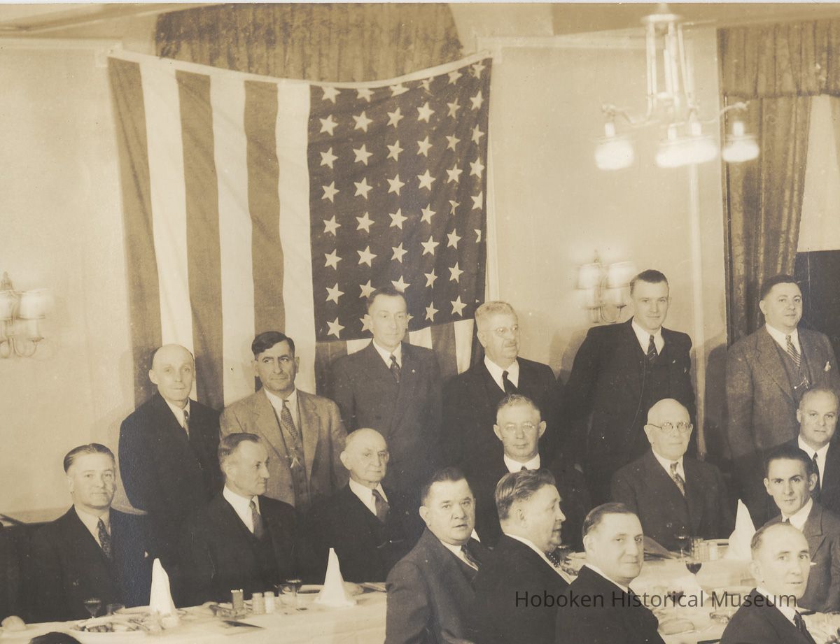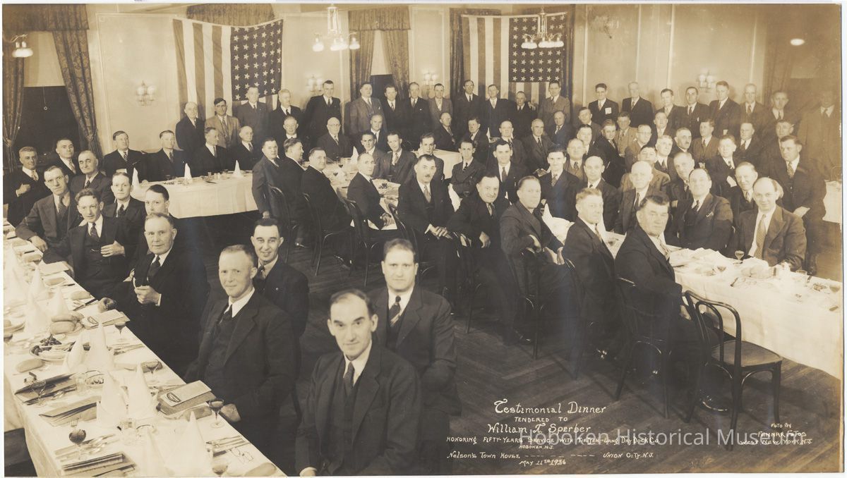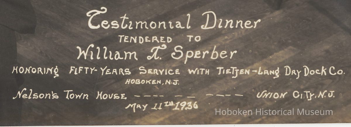 Sepia-tone group photo of a testimonial dinner for William T. Sperber for fifty years of service at Tietjen & Lang Dry Dock Company, Hoboken, NJ. May 11, 1936. At Nelson's Town House, Union City, N.J. 10" high x 18" wide print. Photograph by Fennar Fotos, West New York, N.J. as seen at lower right. Captioned in image. Reverse has pencil notation: Dendel, 3781, 3782, S & Co.