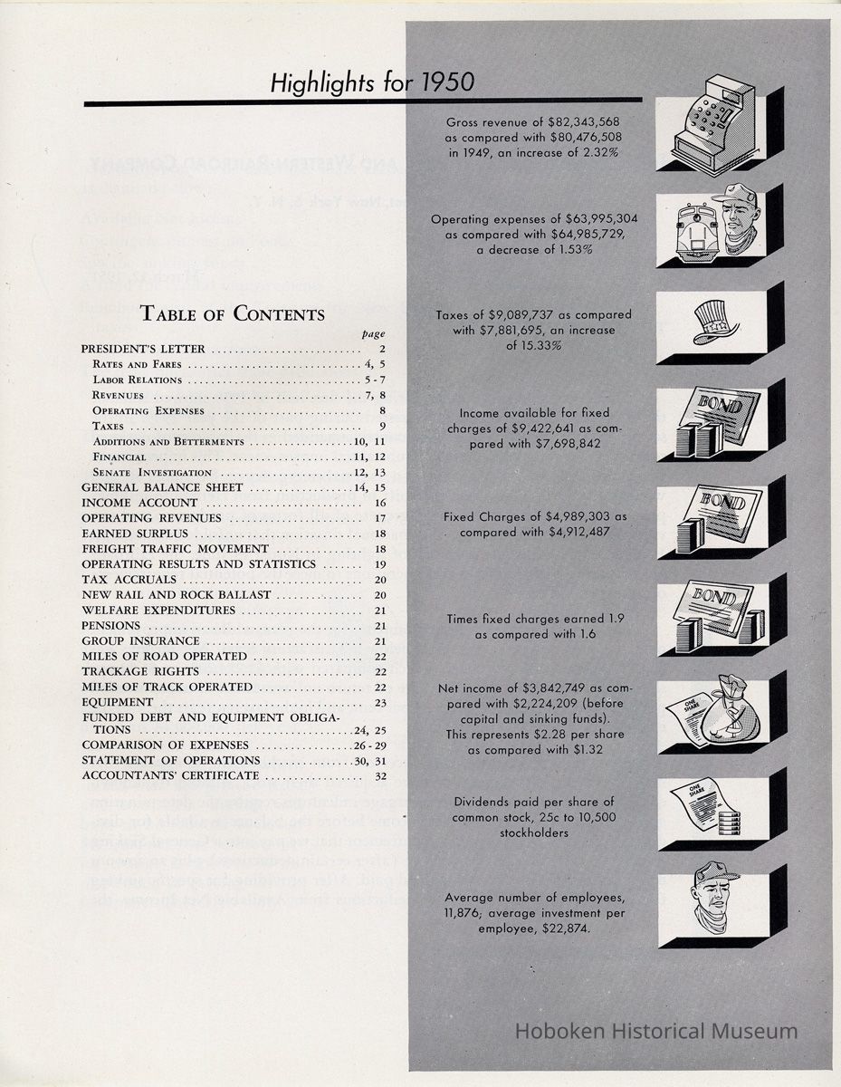 Display Value: Good Notes: 2012.001.0048 D.L. & W. R.R. 99th Annual Report, for 1950. Table of Contents PRESIDENT'S LETTER 2 Rates and Fares 4, 5 Labor Relations 5-7 Revenues .......... 7 Operating Expenses 8 Taxes 9 Additions and Betterments..................10, 11 Financial ..................................11, 12 Senate Investigation .......................12, 13 GENERAL BALANCE SHEET ..................14, 15 INCOME ACCOUNT ........................... 16 OPERATING REVENUES ....................... 17 EARNED SURPLUS ............................. 18 FREIGHT TRAFFIC MOVEMENT . . ............ 18 OPERATING RESULTS AND STATISTICS ....... 19 TAX ACCRUALS ............................... 20 NEW RAIL AND ROCK BALLAST............... 20 WELFARE EXPENDITURES ..................... 21 PENSIONS ..................................... 21 GROUP INSURANCE ....................... .. . 21 MILES OF ROAD OPERATED ................... 22 TRACKAGE RIGHTS ........................... 22 MILES OF TRACK OPERATED .................. 22 EQUIPMENT ................................... 23 FUNDED DEBT AND EQUIPMENT OBLIGATIONS .....................................24, 25 COMPARISON OF EXPENSES .................26-29 STATEMENT OF OPERATIONS ...............30, 31 ACCOUNTANTS' CERTIFICATE................. 32 ----- Highlights of 1950 Gross revenue of $82,343,568 as compared with $80,476,508 in 1949, an increase of 2.32% Operating expenses of $63,995,304 as compared with $64,985729, a decrease of 1.53% Taxes of $9,089,737 as compared with $7,881,695, an increase of 15.33% Income available for fixed charges of $9,422,641 as compared with $7,698,842 Fixed Charges of $4,989,303 as compared with $4,912,487 Times fixed charges earned 1.9 as compared with 1.6 Net income of $3,842,749 as compared with $2,224,209 (before capital and sinking funds). This represents $2.28 per share as compared with $1.32 Dividends paid per share of common stock, 25c to 10,500 stockholders Average number of employees, 11,876; average investment per employee, $22,874. Status: OK Status By: dw Status Date: 2012-06-15