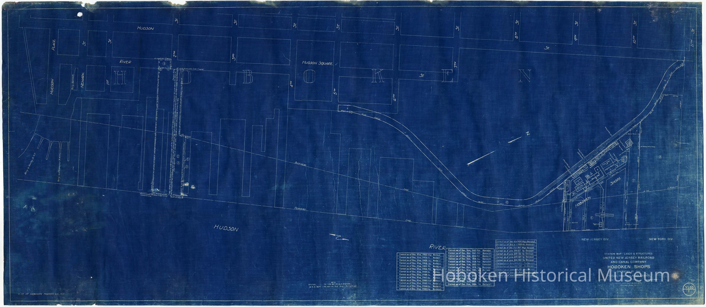 Map: United New Jersey Railroad & Canal Co.; Hoboken Shops; Operated by the Pennsylvania R.R., Lessee. Created 1918; last revised Dec. 31, 1955.