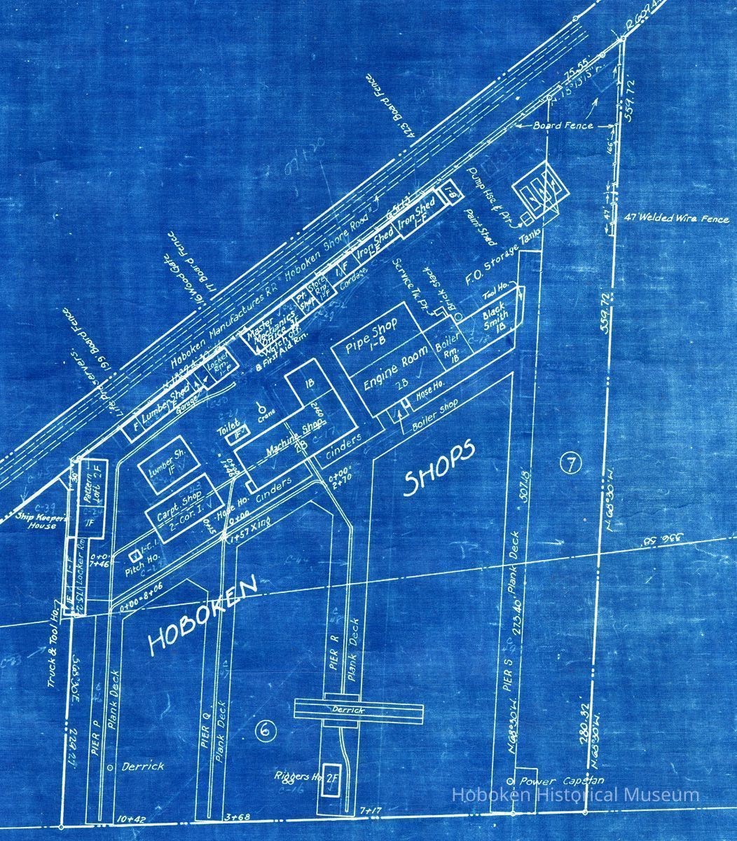 Blueprint of map showing the Hoboken waterfront from Eleventh street south to Lackawanna Terminal. It features the site plan of Hoboken Shops of the P.R.R. Marine Department in some detail at the Hudson River and River Road approximately between Ninth and Tenth Streets. A repair and storage facility that was used by the railroad for berthing and maintenance of tugboats in its marine fleet. They were used for moving carfloats in New York Harbor. The property plan has dimensions plus named buildings and structures.