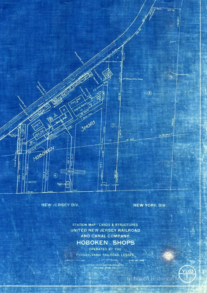 Notes: 2012.030.0001 NEW JERSEY DIV NEW YORK DIV STATION MAP - LANDS & STRUCTURES UNITED NEW JERSEY RAILROAD AND CANAL COMPANY HOBOKEN SHOPS OPERATED BY THE PENNSYLVANIA RAILROAD, LESSEE Scale: 1" = 100' June 30, 1918. OFFICE OF VALUATION ENGINEER, PHILADELPHIA, PA. [sheet] V1.03 1 ===== Full sheet assembled scans at 50%; details 100 percent or larger. Status: OK Status By: dw Status Date: 2012-06-20