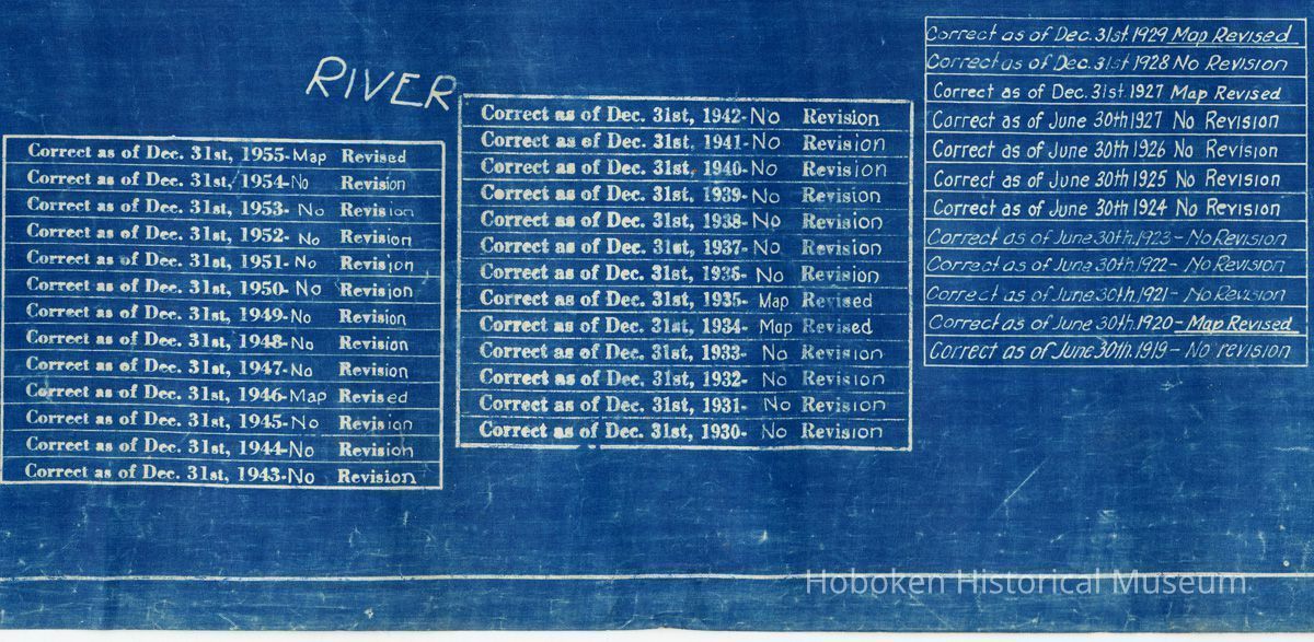 Map originated June 30, 1918. Apparently traced from a survey map or plat book of the era, but source is not stated. Title at lower left corner: City of Hoboken, Hudson Co. [County], N.J. Three tables record annual review dates for the sheet, from 1919 to Dec. 31, 1955. The map was only occasionally revised.