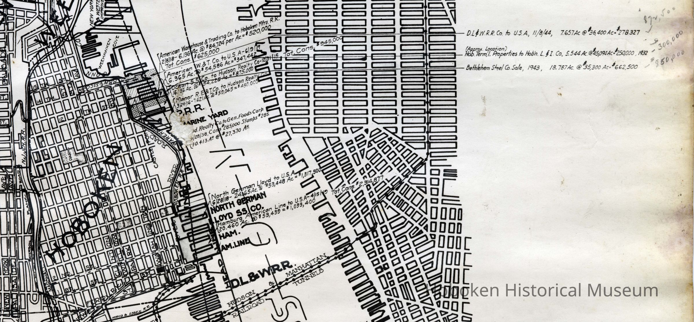 While dated 1922, it presents selectively recorded real estate transactions from 1912 up to June 1945. Composed of three black-and-white photostatic prints joined to make a single rolled sheet, ca. 22" x 51" high. Except for some penciled dollar values and one ink cross-out, all information was handwritten on the original source document. Original source not indicated or known nor date of duplication. This map is from the former Hoboken residence of Dominic Calabrese.