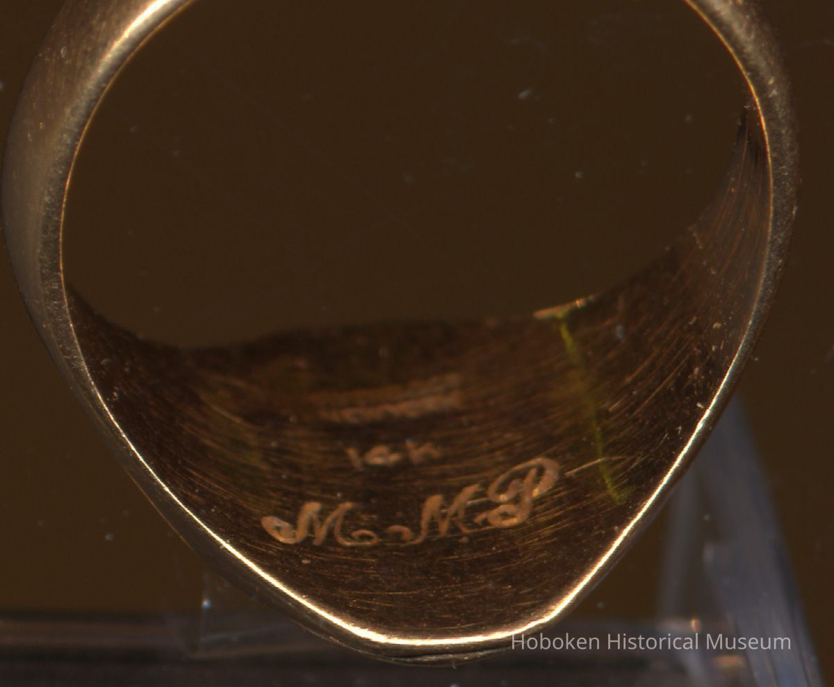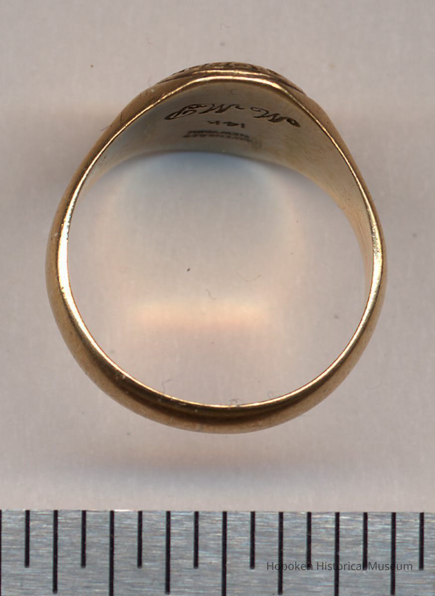 Class of 1926 ring, Joseph F. Brandt Junior High School, Hoboken, belonging to Mildred Marion "Molly" Pescatore of Hoboken. Stamped 14k gold. Inscribed inside are her initials: M.M.P. Maker's mark: Haven & Co., New York.