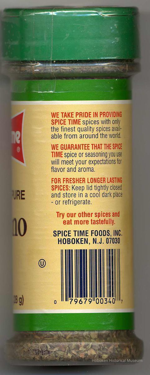 Labeled bottle: Spice Time Naturally Pure Oregano, Hoboken, NJ, no date, ca. 2000-2004. Clear plastic one-ounce capacity bottle with green screw cap, 5-3/8" high x 2-1/8" diameter. Printed label. Safety sealed.