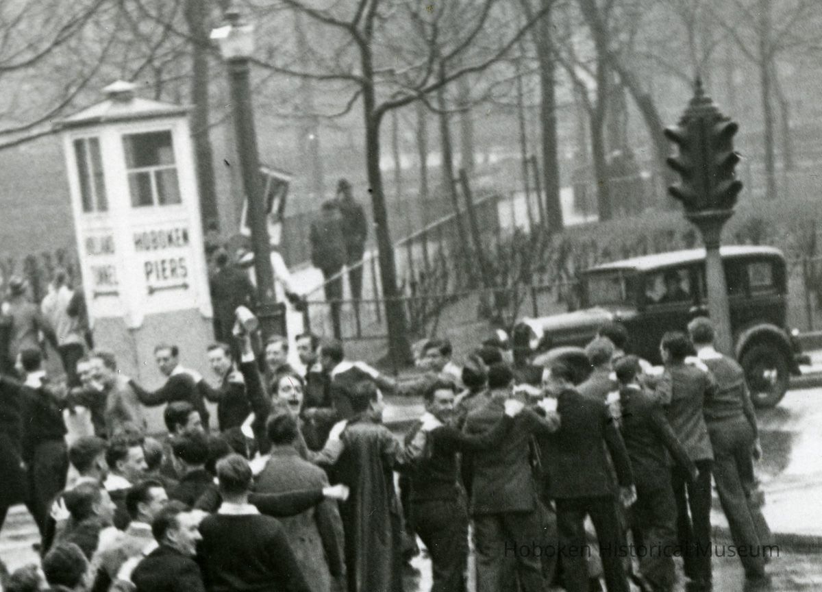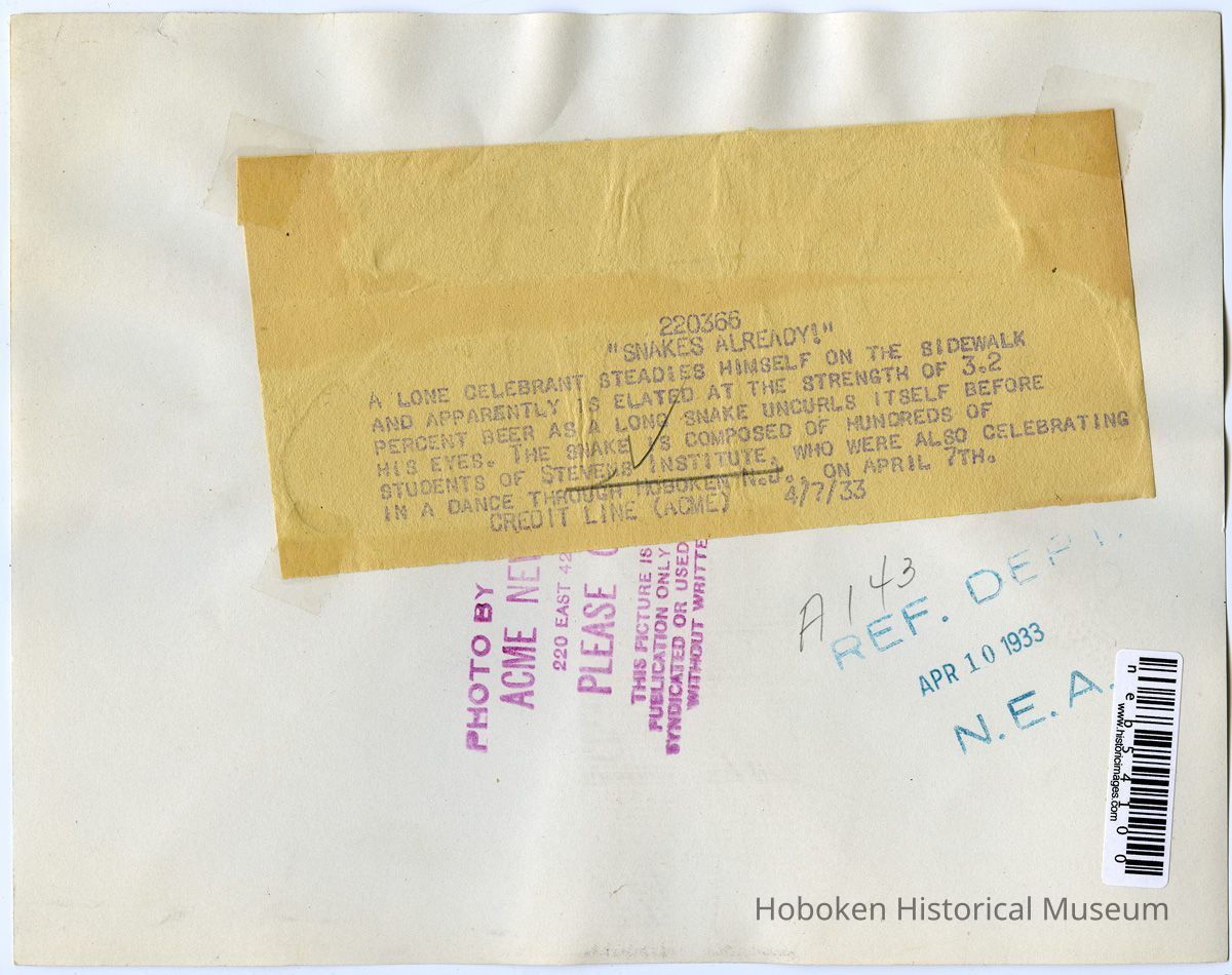 B+W photo of Stevens Institute students in snake line celebrating legalization of 3.2 pct beer, at 4th & Hudson Sts., Hoboken, Apr. 7, 1933.