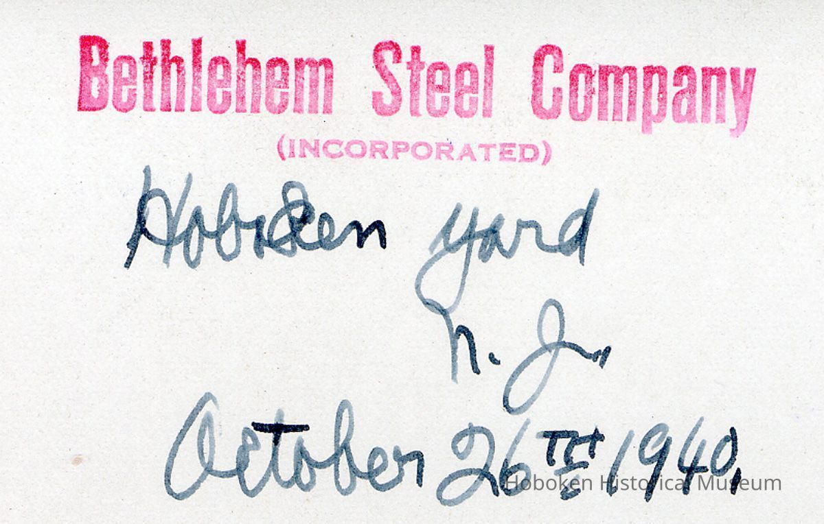 Black-and-white photo of machine shop with view inside of one-half of a shaft support rame from the M.V. Ringstad at Bethlehem Steel Shipyard, Hoboken Division, Oct. 26, 1940. 8" x 10" wide print. Photograph taken by William Craig. Reverse has yard stamp and holographic ink location and date.