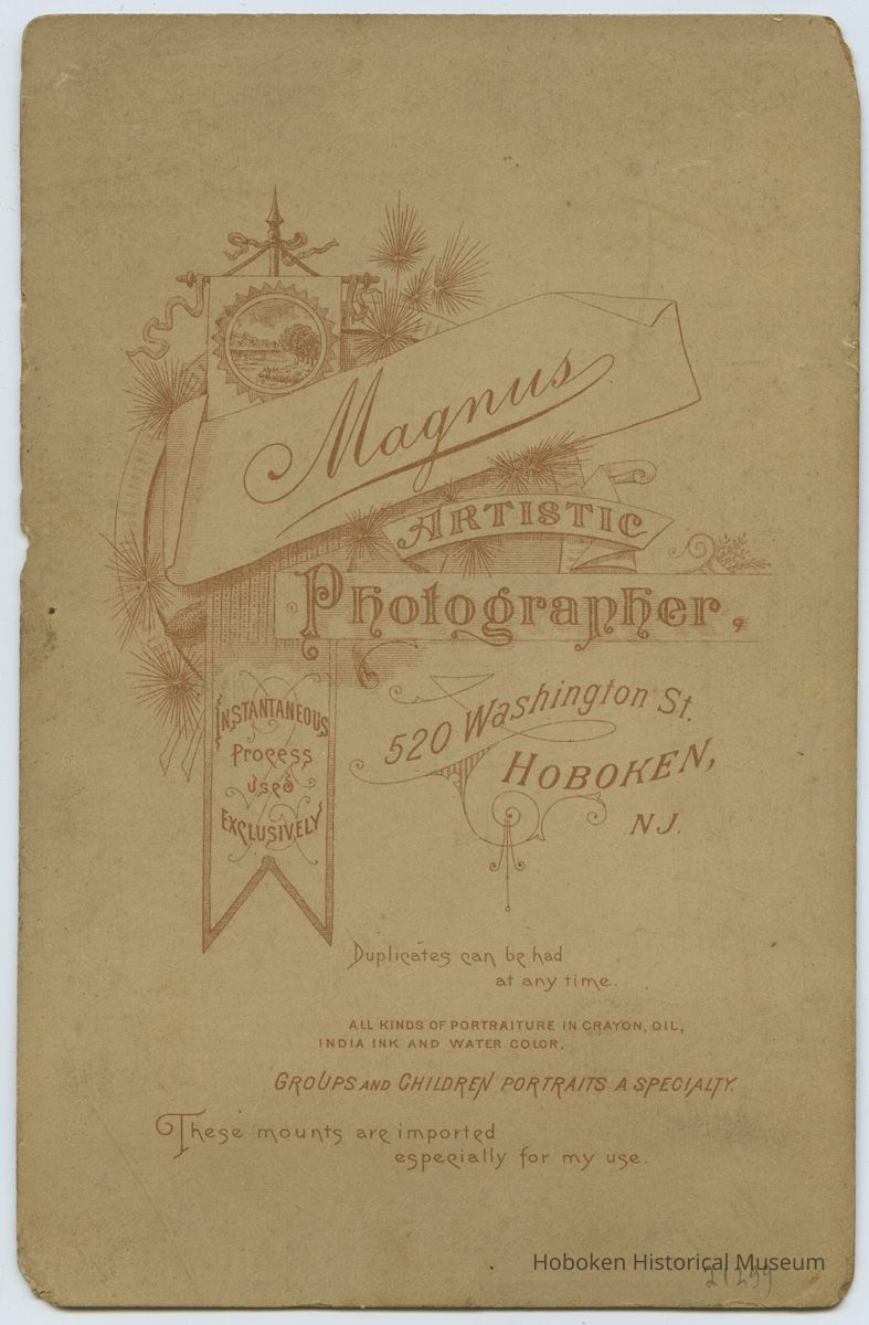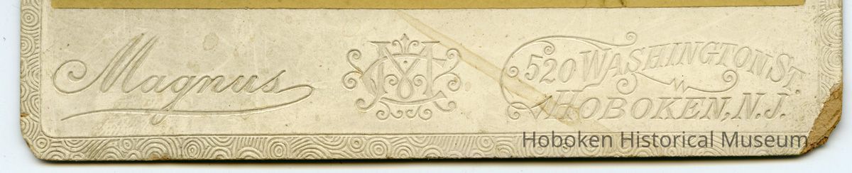4-1/4" x 6-1/2" photographer's embossed mount. Photograph taken by [Conrad] Magnus, Artistic Photographer, 520 Washington St., Hoboken, N.J. Imprinted on front including CM monogram with fuller imprint on back.