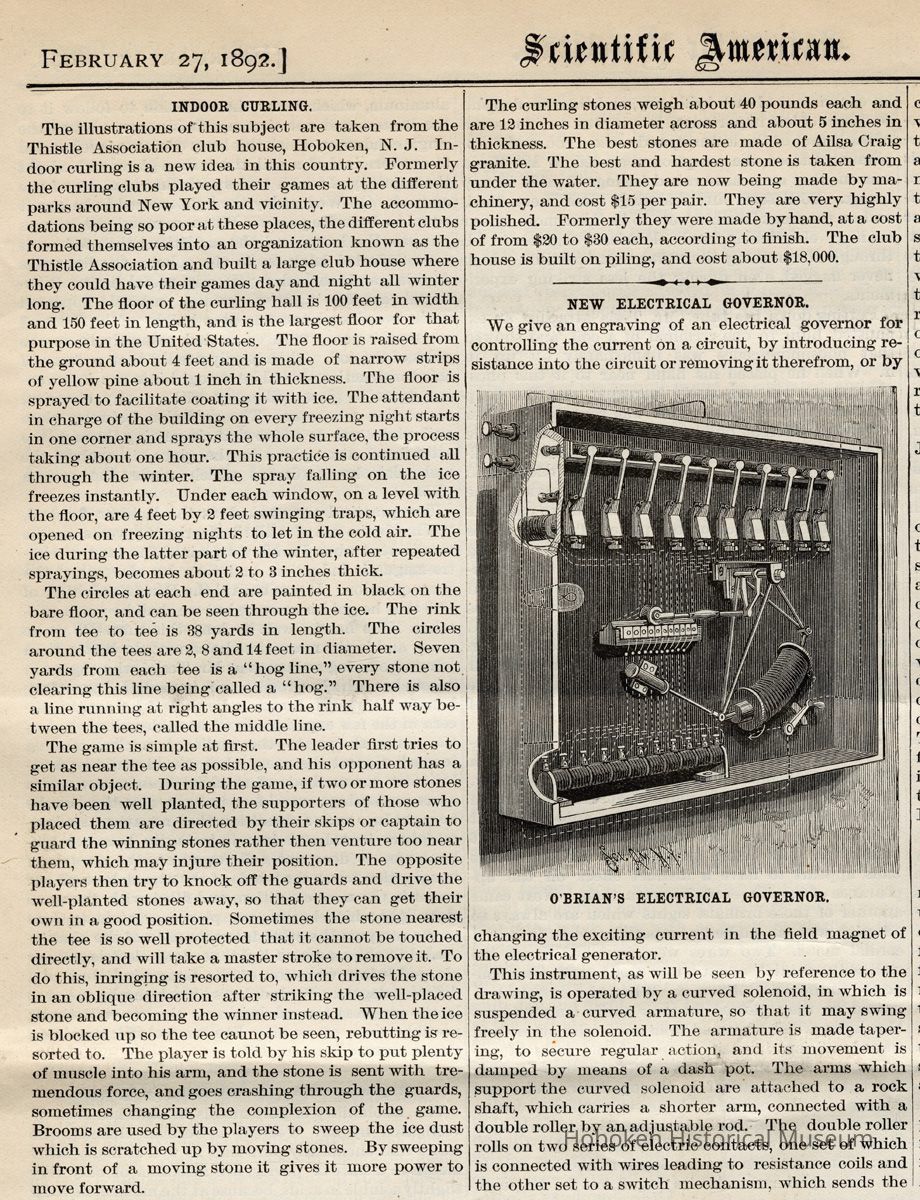 Article: Indoor Curling. (Thistle Association club house); Scientific American, Vol. LXVI, No. 9, Feb. 27, 1892.