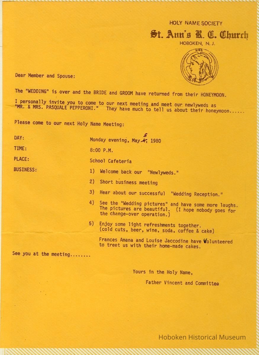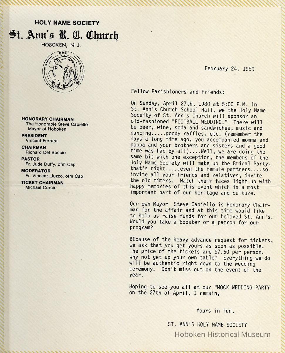 Notes: Photos 2014.020.0001 ==== Menu Soave & Bardovino Wines Beer and Soda Snacks Plain Old - Fashioned Sand. (Football Style) Cream Puffs & Coffee Music * Dancing P.S. Any goodies you would like to bring for your own table are welcome. ----- Mr. and Mrs. Holy Name Society of St. Ann's Church, Hoboken will be honored with your presence at the marriage celebration for GUISEPPINA CANNOLI AND PASQUALE PEPPERONI on SUNDAY, APRIL 27, 1980 at 5:00 p.m. wedding ceremony will start promptly at 5:30 p.m. Reception will be held at ST. ANN'S SCHOOL HALL 555 SEVENTH STREET HOBOKEN, NEW JERSEY "non mi fa scumpari” Regalo: $7.50 per person (sette e cinquonto) R.S.V.P. By APRIL 20, 1980 For Tickets coll: Jack Raslowsky - 659-0082 Rectory - 659-1114 ==== HOLY NAME SOCIETY St. Ann's R.C. Church HOBOKEN, N.J. HONORARY CHAIRMAN The Honorable Steve Capiello Mayor of Hoboken PRESIDENT Vincent Ferrara CHAIRMAN Richard Del Boccio PASTOR Fr. Jude Duffy, ofm Cap MODERATOR Fr. Vincent Liuzzo, ofm Cap TICKET CHAIRMAN Michael Curcio February 24, 1980 Fellow Parishioners and Friends: On Sunday, April 27th, 1980 at 5:00 P.M. in St. Ann's Church School Hall, we the Holy Name Soceity of St. Ann's Church will sponsor an old-fashioned "FOOTBALL WEDDING." There will be beer, wine, soda and sandwiches, music and dancing goody raffles, etc. (remember the days a long time ago, you accompanied momma and poppa and your brothers and sisters and a good time was had by all)....Well, we are doing the same bit with one exception, the members of the Holy Name Society will make up the Bridal Party, that's right even the female partners.... so invite all your friends and relatives, invite the old timers. Watch their faces light up with happy memories of this event which is a most important part of our heritage and culture. Our own Mayor Steve Capiello is Honorary Chairman for the affair and at this time would like to help us raise funds for our beloved St. Ann's Would you take a booster or a patron for our program? BEcause of the heavy advance request for tickets we ask that you get yours as soon as possible. The price of the tickets are $7.50 per person. Why not get up your own table? Everything we do will be authentic right down to the wedding ceremony. Don't miss out on the event of the year. Hoping to see you all at our "MOCK WEDDING PARTY on the 27th of April, I remain, Yours in fun, ST. ANN'S HOLY NAME SOCIETY ==== HOLY NAME SOCIETY St. Ann's R.C. Church HOBOKEN, N.J. Dear Member and Spouse: The "WEDDING" is over and the BRIDE and GROOM have returned from their HONEYMOON. I personally invite you to come to our next meeting and meet our newlyweds as “MR. & MRS. PASQUALE PEPPERONI." They have much to tell us about their honeymoon....... Day: Monday evening, May 5 1980 Time: 8:00 P.M. Place: School Cafeteria Business: 1) Welcome back our ‘’Newlyweds." 2) Short business meeting 3) Hear about our successful "Wedding Reception." 4) See the "Wedding pictures" and have some more laughs. The pictures are beautiful. (I hope nobody goes for the change-over operation.) 5) Enjoy some light refreshments together. (cold cuts, beer, wine, soda, coffee & cake) Frances Amana and Louise Jaccodine have Volunteered to treet us with their home-made cakes See you at the meeting Yours in the Holy Name, Father Vincent and Committee ==== ==== Original or Copy: Digital copy Status: OK Status By: dw Status Date: 2014-04-18