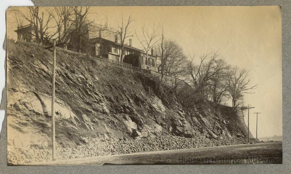 Sepia tone photo of Castle Point, Stevens Castle, from River Walk about 7th Street, Hoboken, no date, circa 1875-1885.